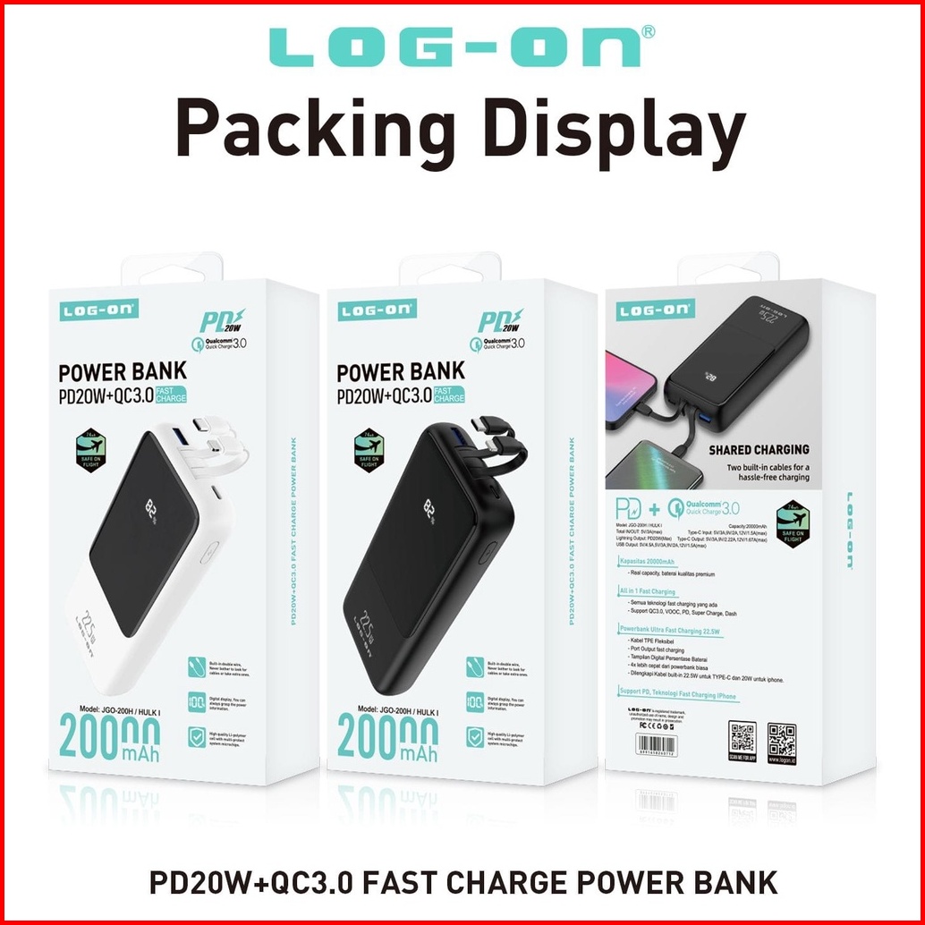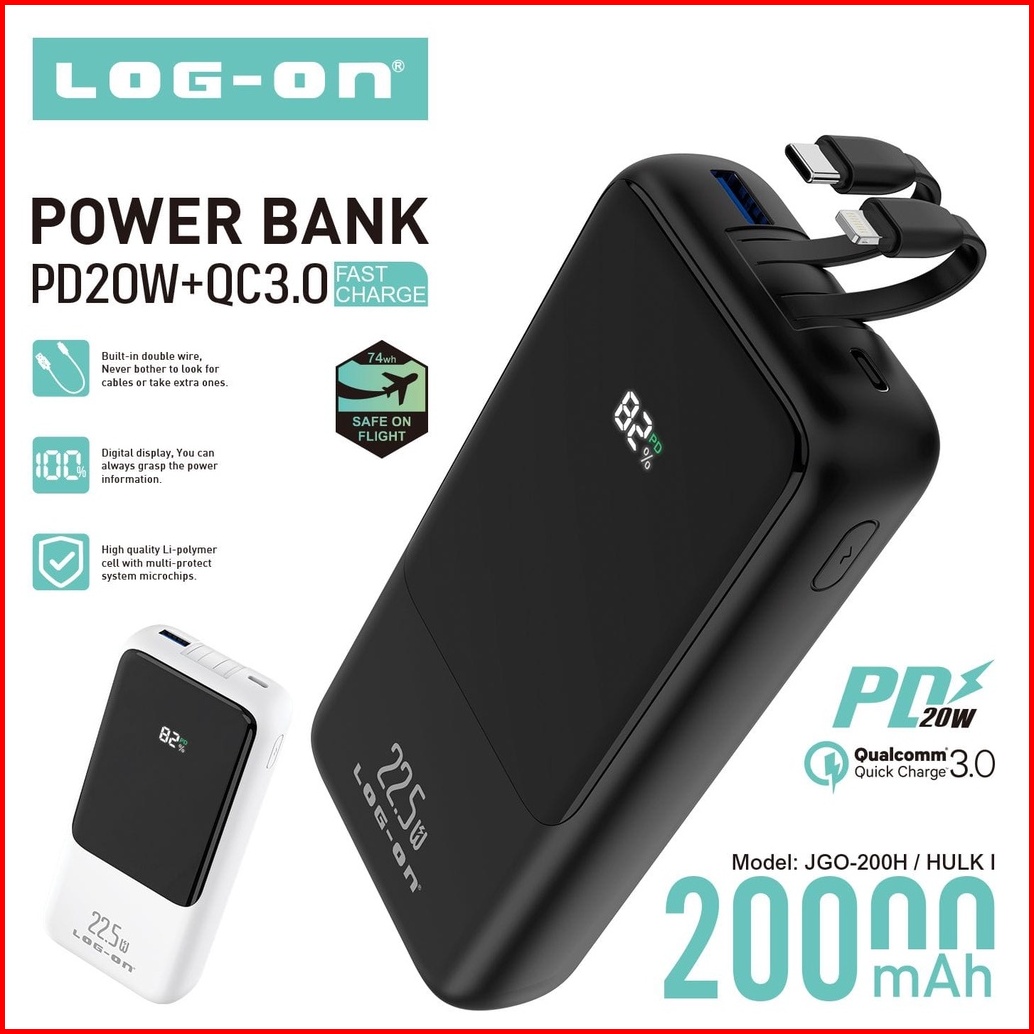 Log On Powerbank 22.5w 20.000mah Pd Qc3.0 Jgo-200h Built In Cable Iphone Type C Fast Charging-garansi Resmi