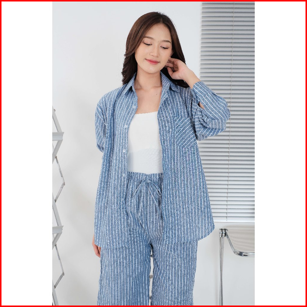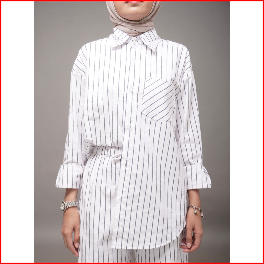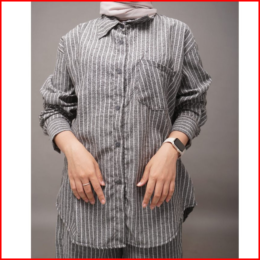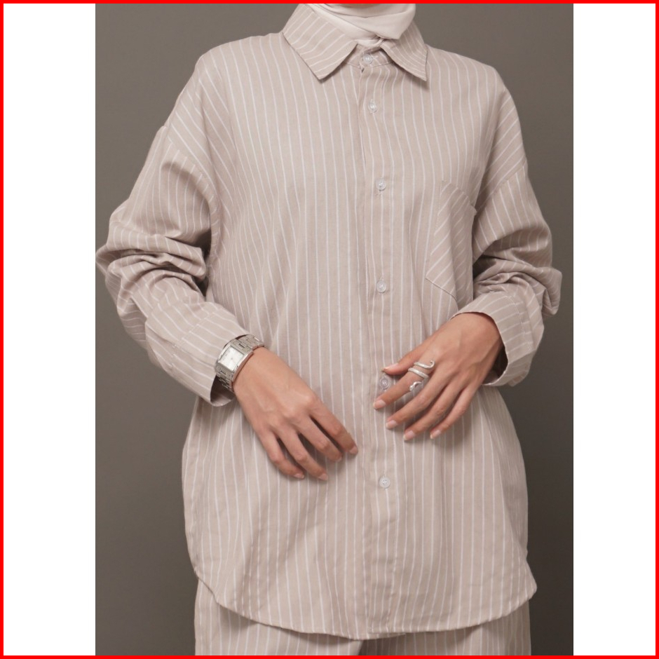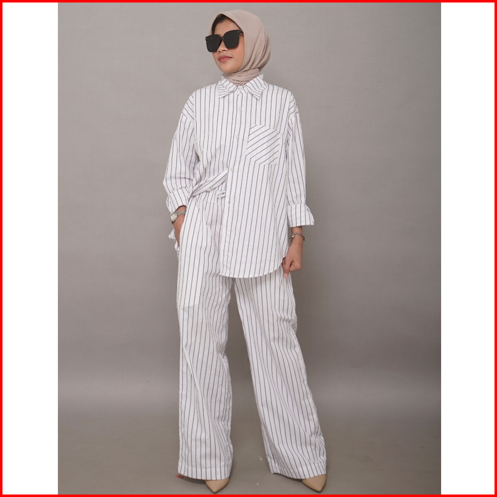 Ghania Oneset - Stripe Oneset - Oversize Oneset - Setelan Kemeja Salur Garis Oversize - Setelan Wanita Salur - Stripe Sh