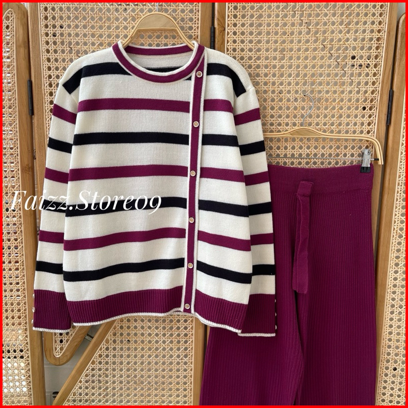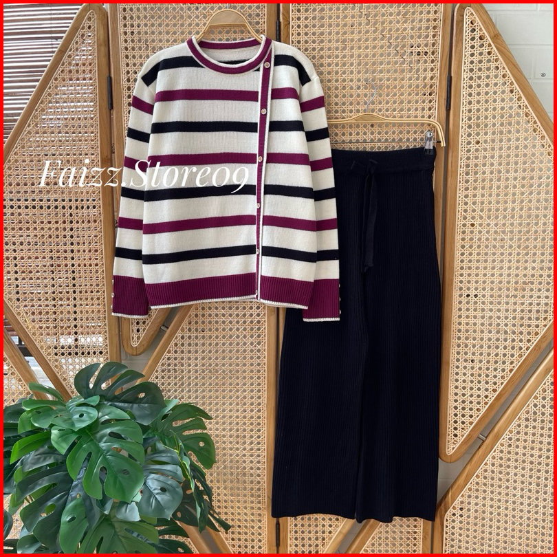 Oneset Delima Sweater Rajut Motif Stripe Setelan Celana Kulot Wanita Lengan Panjang Premium Kekinian