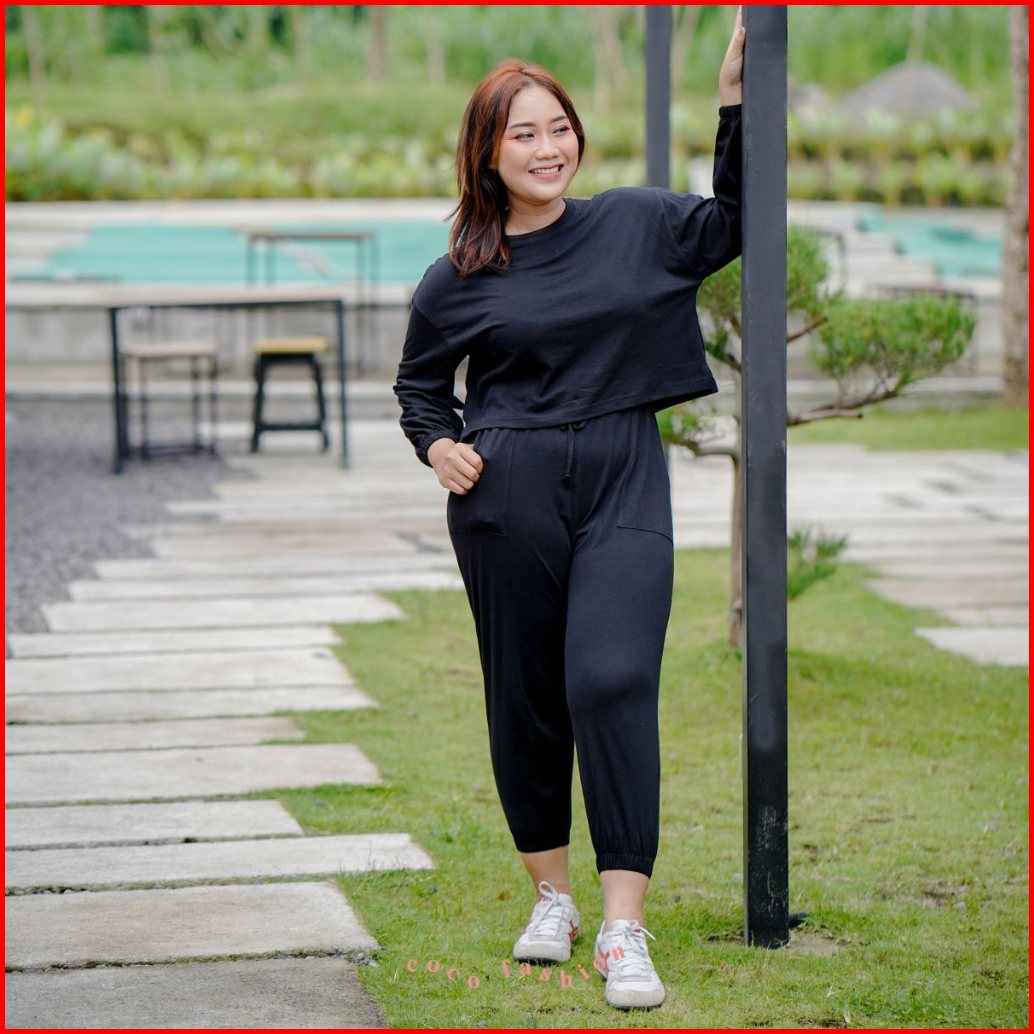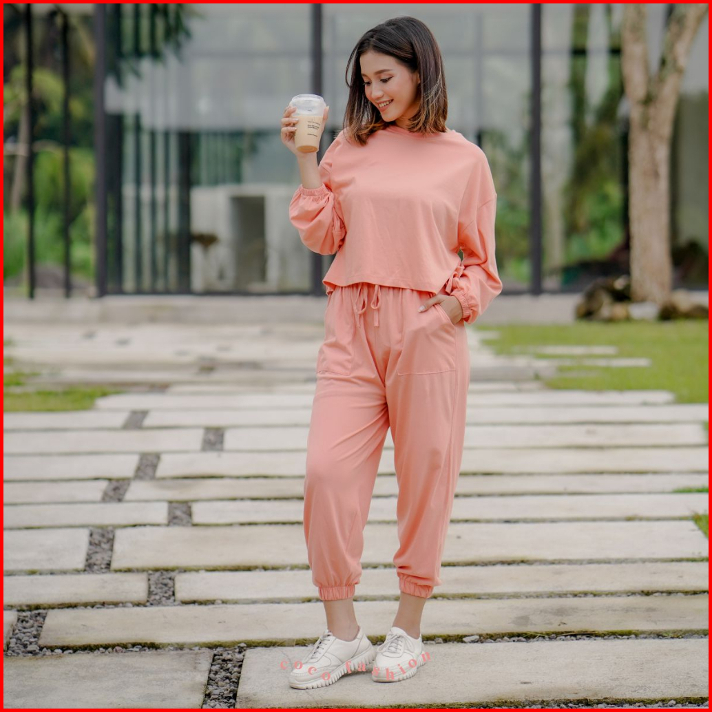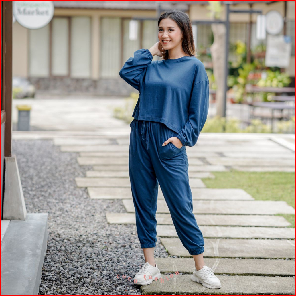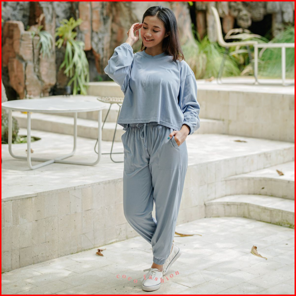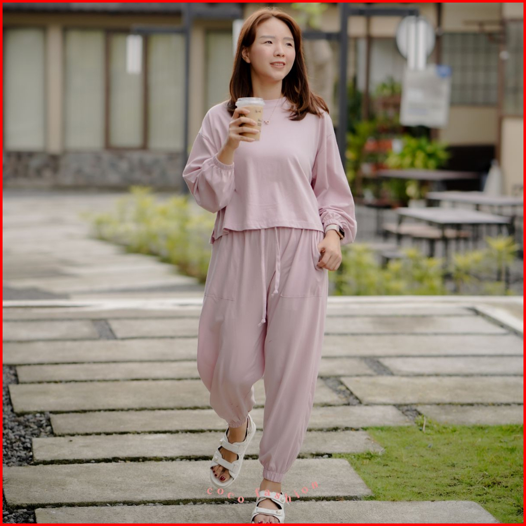 One Set Cotton Lengan Panjang Celana Jogger Setelan Wanita Jennie