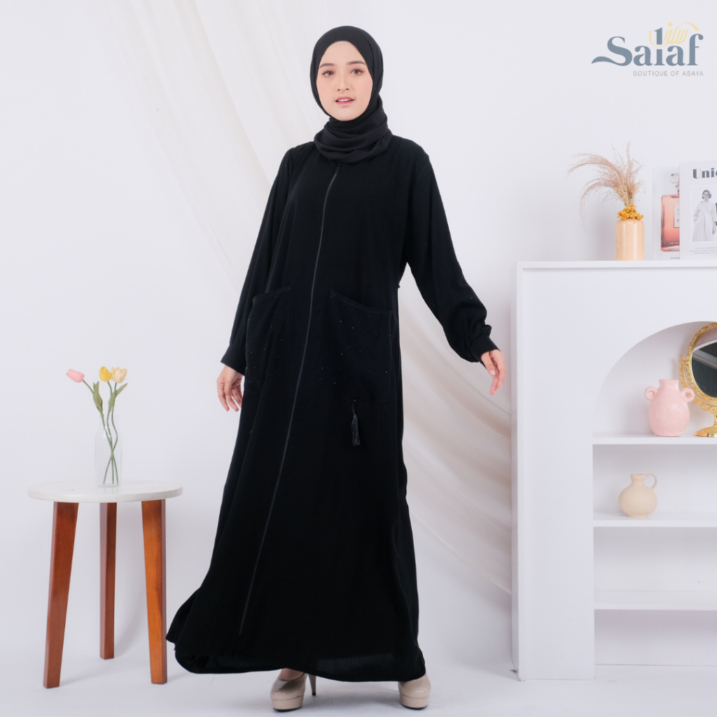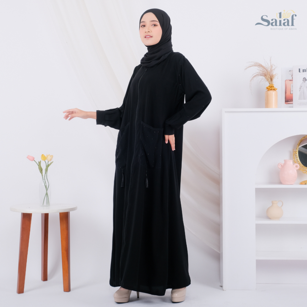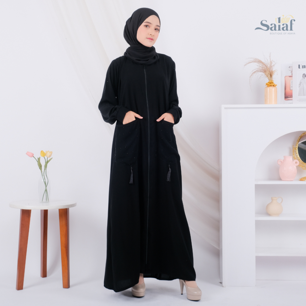 Abaya Hitam Turkey Bahan Jetblack Kombinasi Rumbai Kuncir