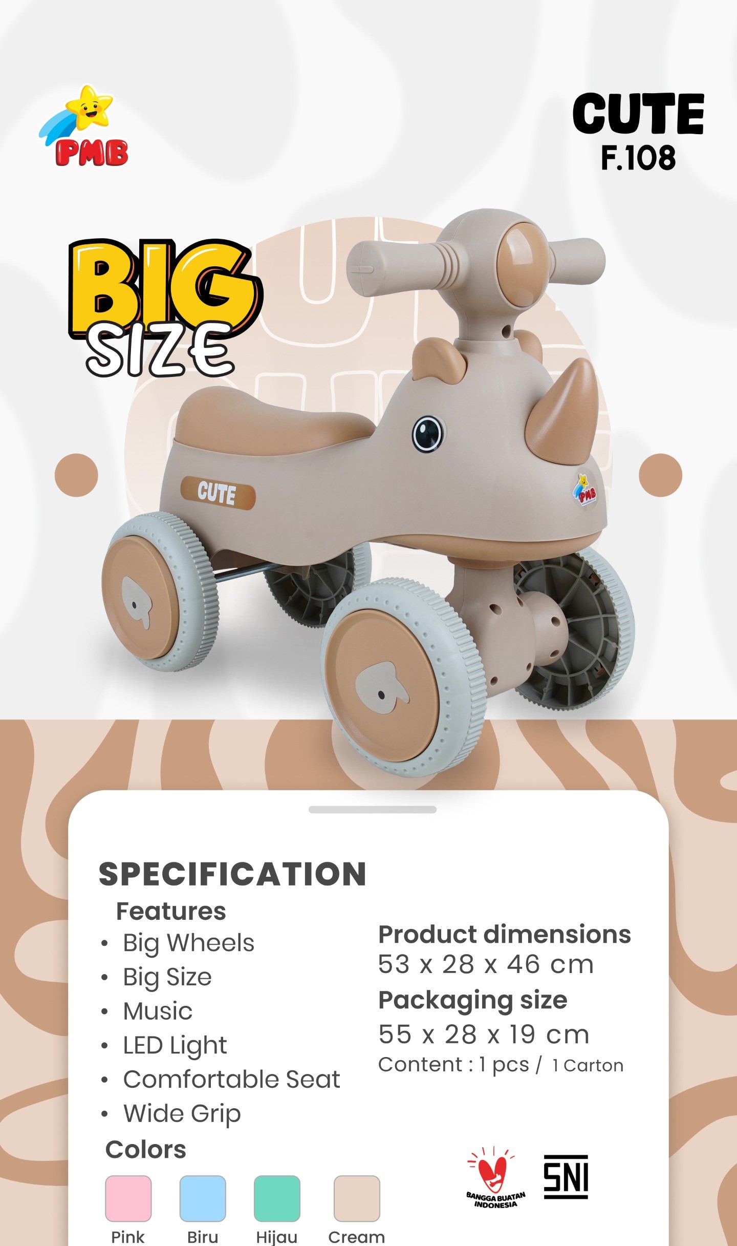 F 108 RIDE ON CUTE F108 BIG WHEELS MUSIK LED LAMPU MAINAN ANAK PMB TOYS
