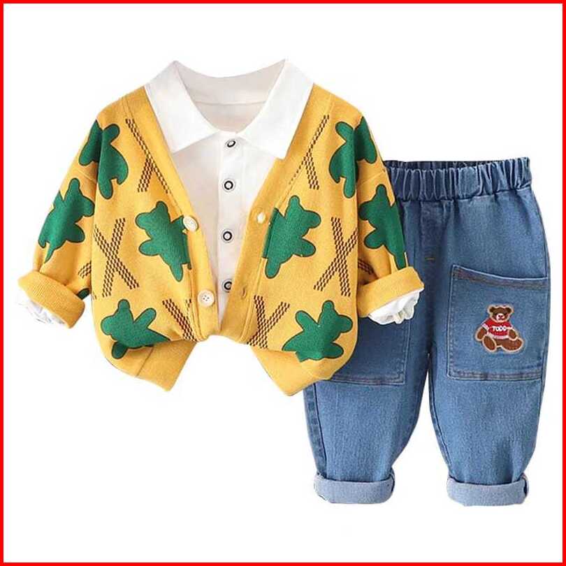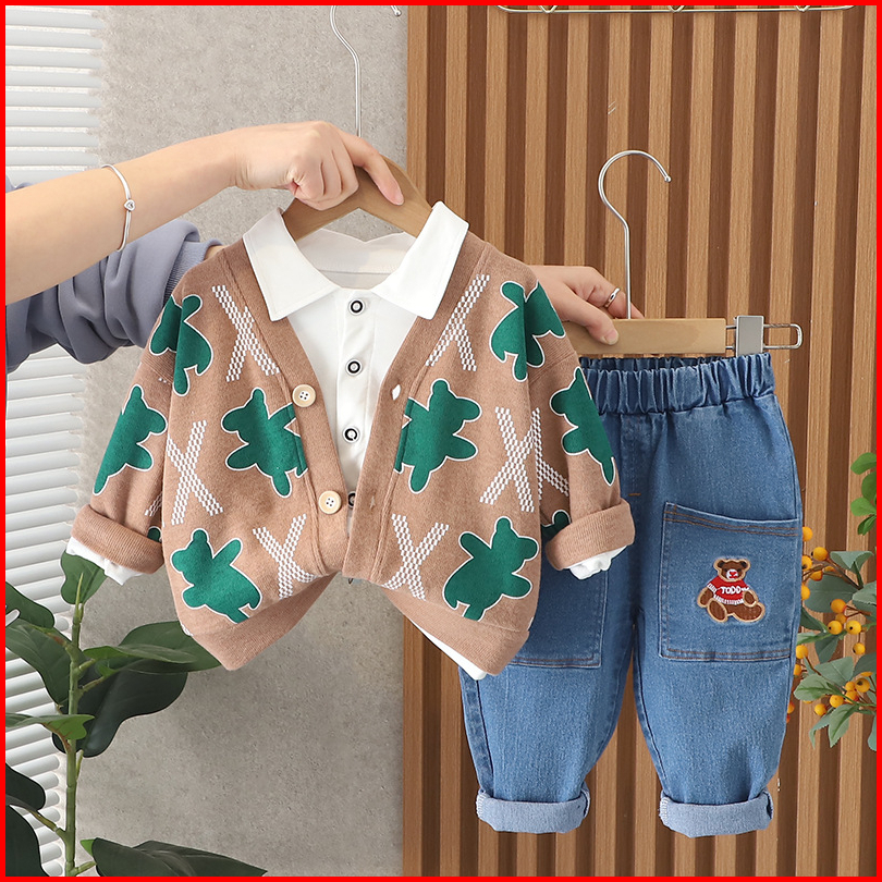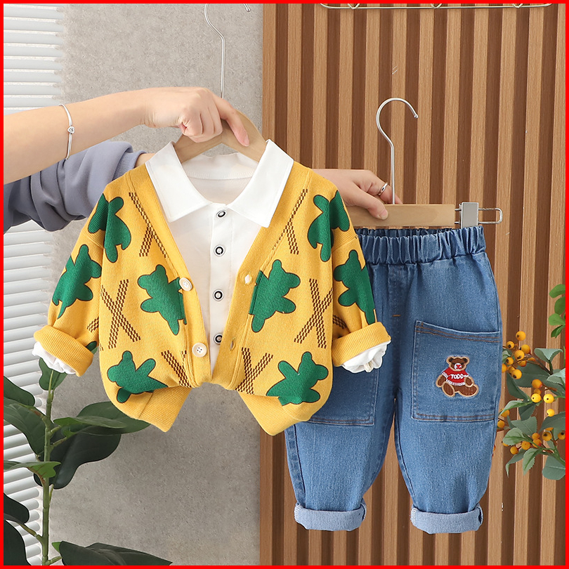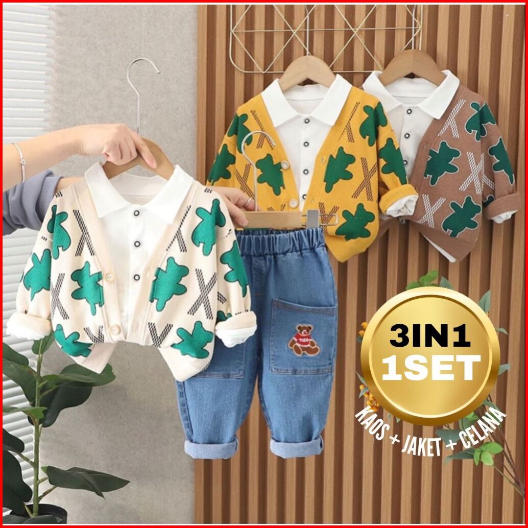 Meandboss Ssl54 3in1 Setelan Baju Anak Cowok Laki 3in1 Set Kaos Rajut Rompi Celana Panjang Jeans