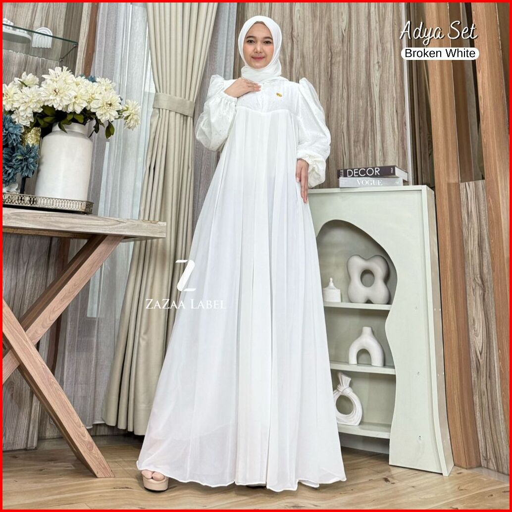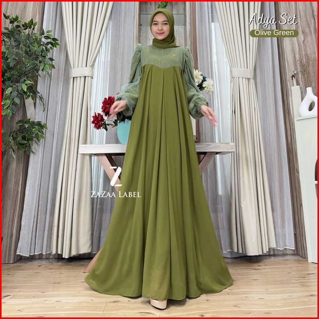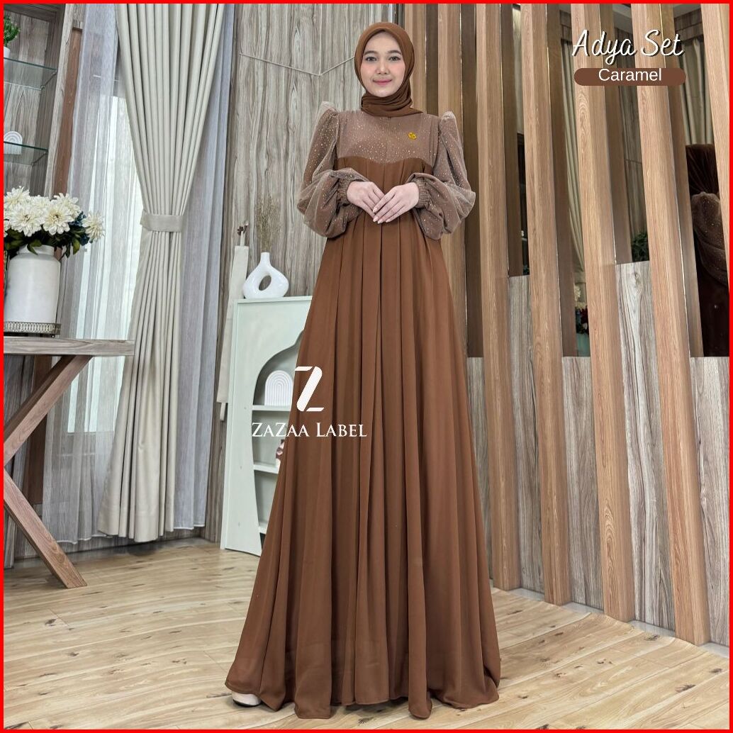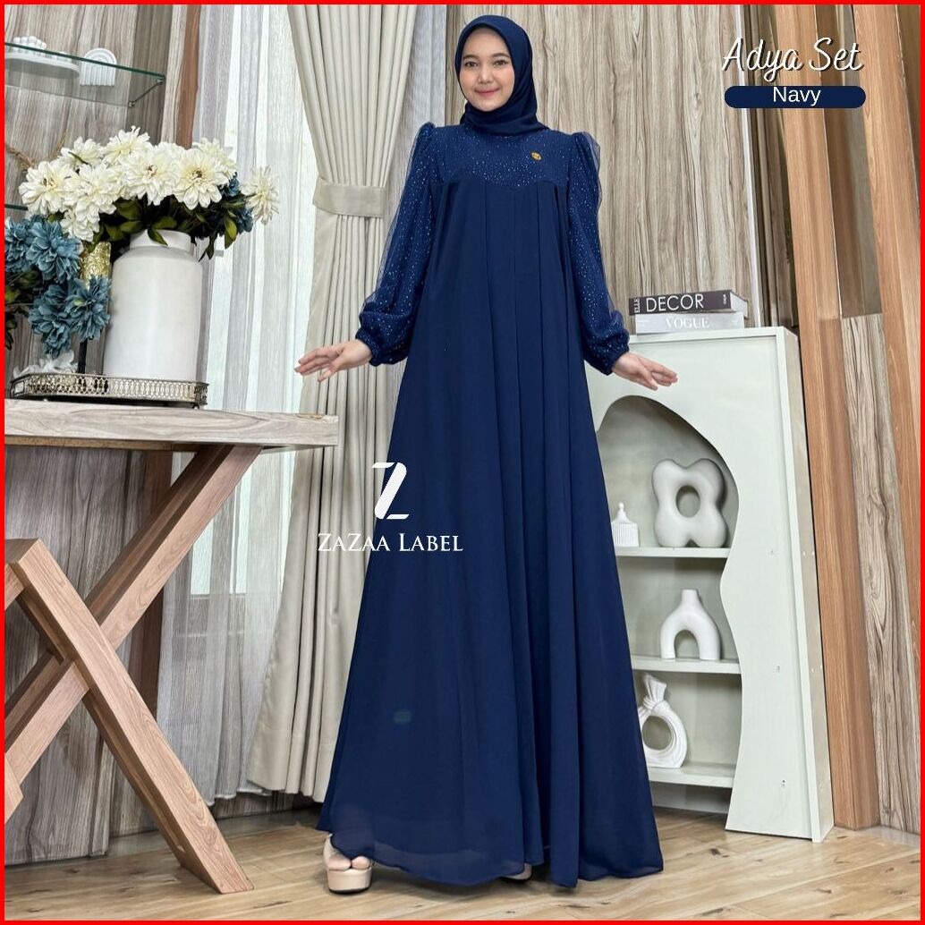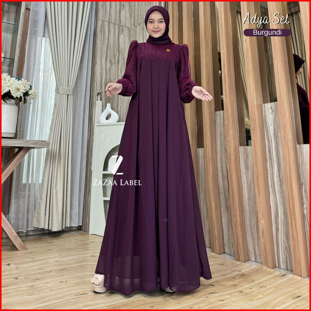 Zazaa Label - Adya Set Gamis Hijab Motif Polos Bahan Ceruty Babydoll Full Furing Kombinasi Tile Gliter Sparkling Pesta M