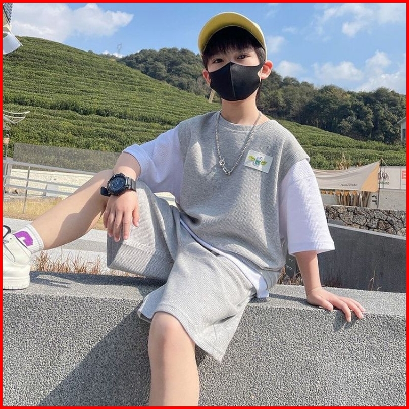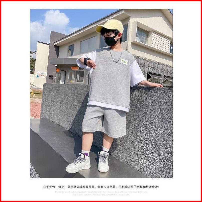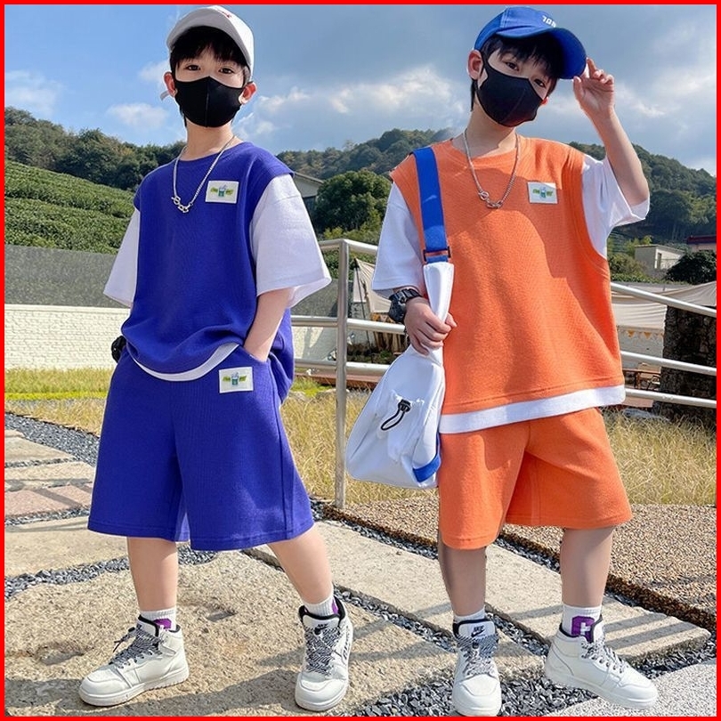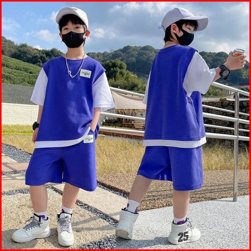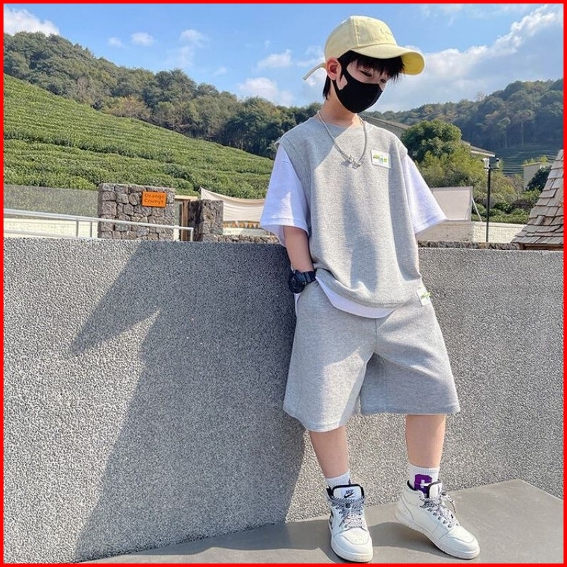 Ljs269 Setelan Kombinasi Polos Anak Laki Laki Kaos Celana Pendek Baju Anak Cowok Usia Tanggung 3-14 Tahun