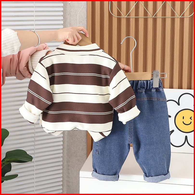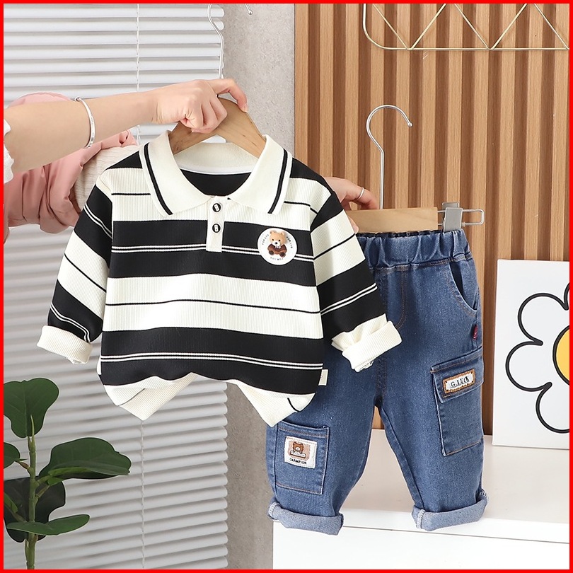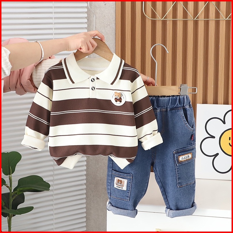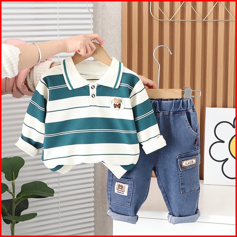 Setelan Anak Laki Laki Baju Set Lengan Panjang Kerah Polo Dan Celana Jeans Model