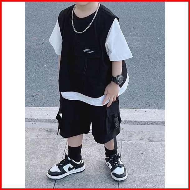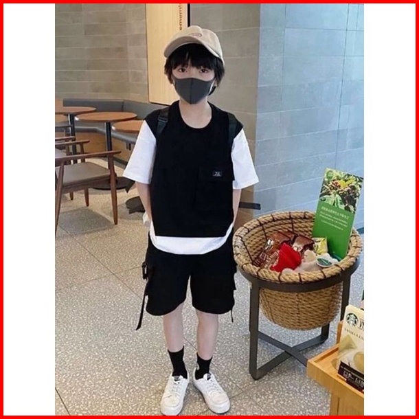 Ljs27 Setelan Hitam Putih Polos Anak Laki Laki Cool Kaos Celana Pendek Baju Anak Cowok Usia Tanggung 3-14 Tahun