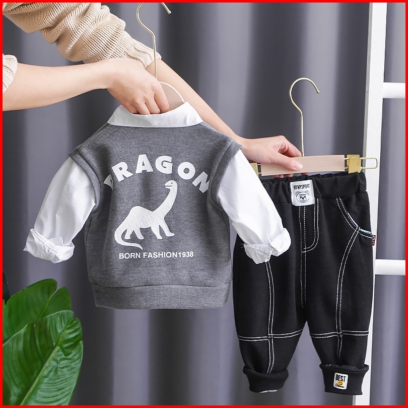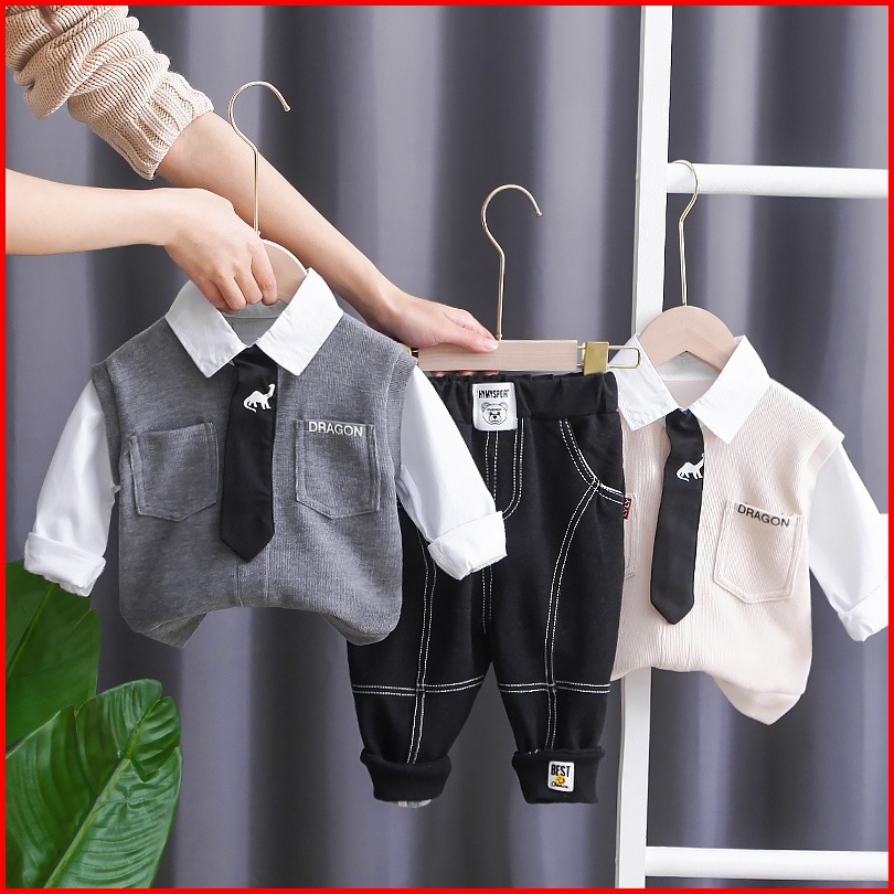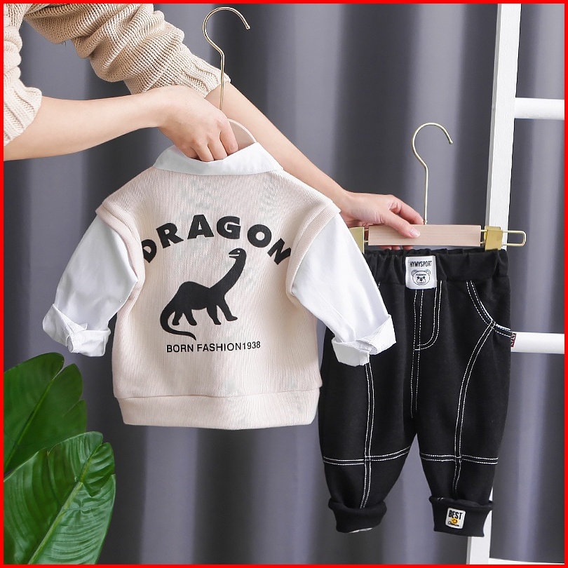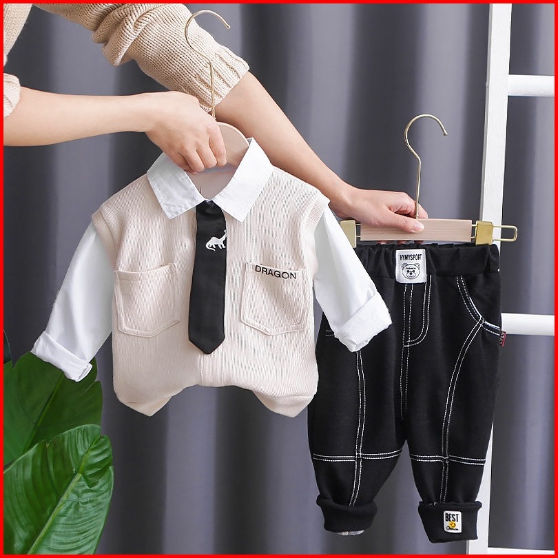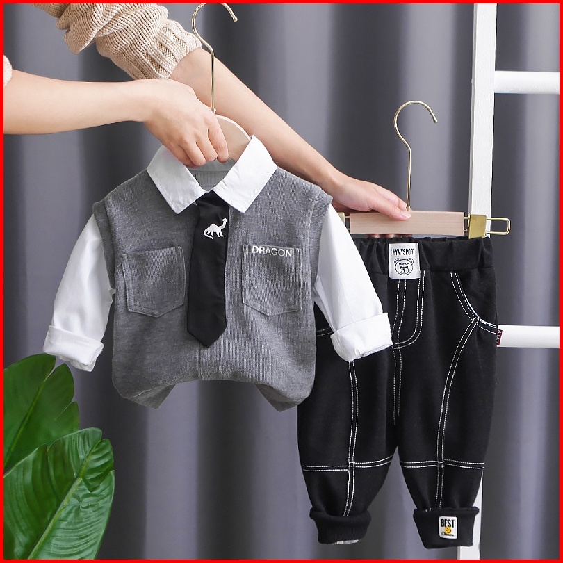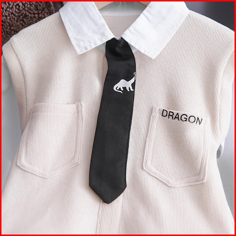 Setelan Kemeja Anak Laki Laki Import Kemeja Gambar Dragon Anak Balita Impor Setelan 2pcs Kemeja Lengan Panjang Dasi Hita