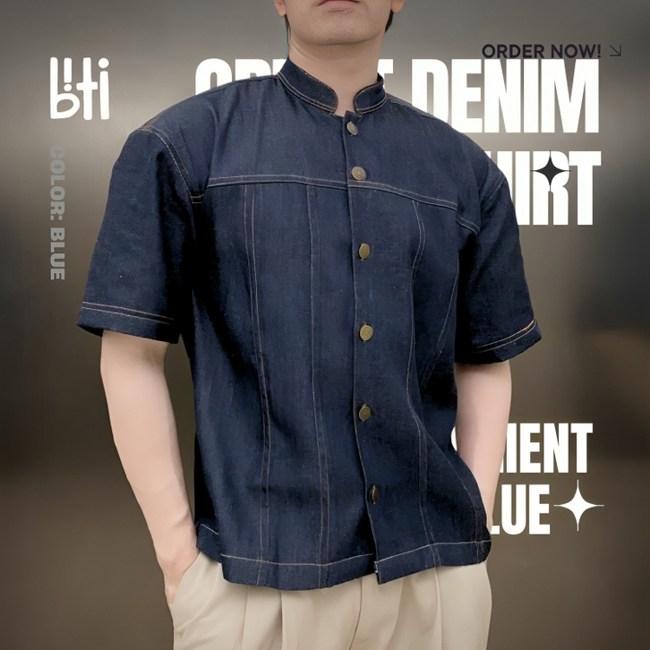 BITI Orient Denim Shirt | Kemeja Outer Koko Denim Jeans Pria Lengan Pendek Kerah Shanghai Oriental