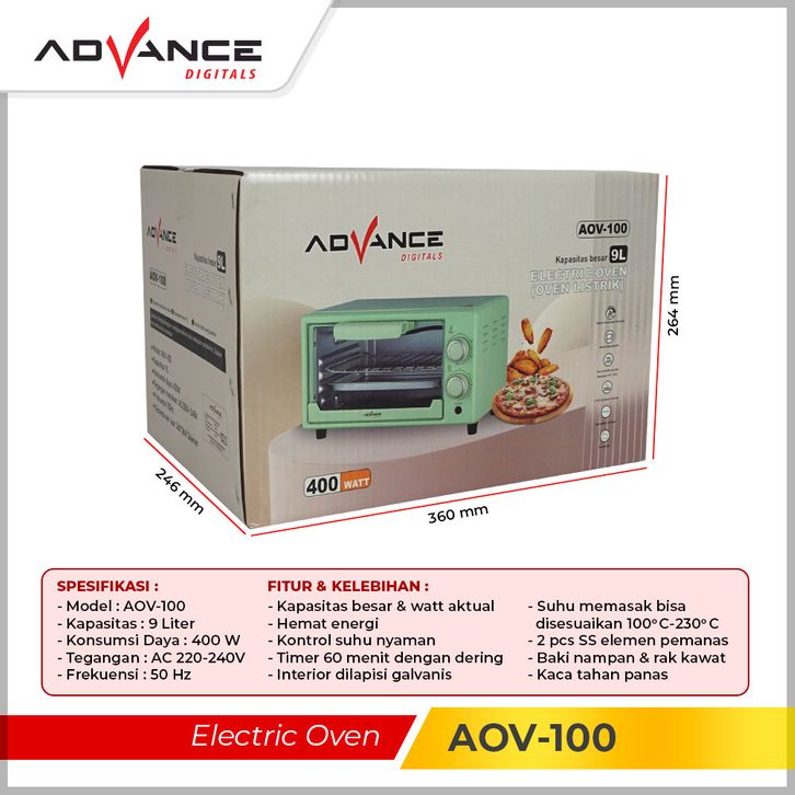Advance AOV100 Oven Listrik Alat Pemanggang dan Menghangatkan Masakan Kapasitas 9L Daya 500 Watt Garansi Resmi 1 Tahun