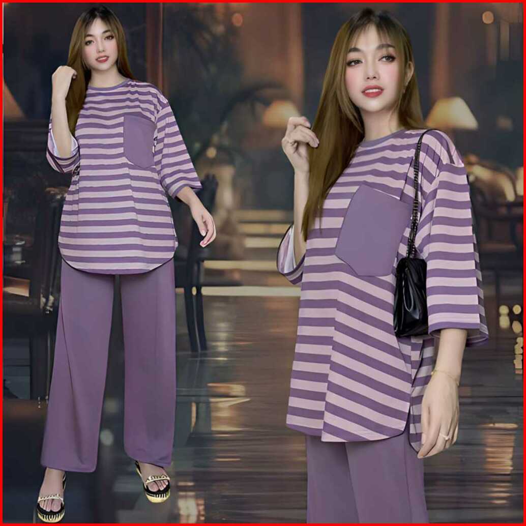 Aufaa Oneset Atasan Oval Kantong Dada Ld 120 Vistaterry Motif Salur Celana Karet Wanita Setelan Baju Basic Panjang Overs