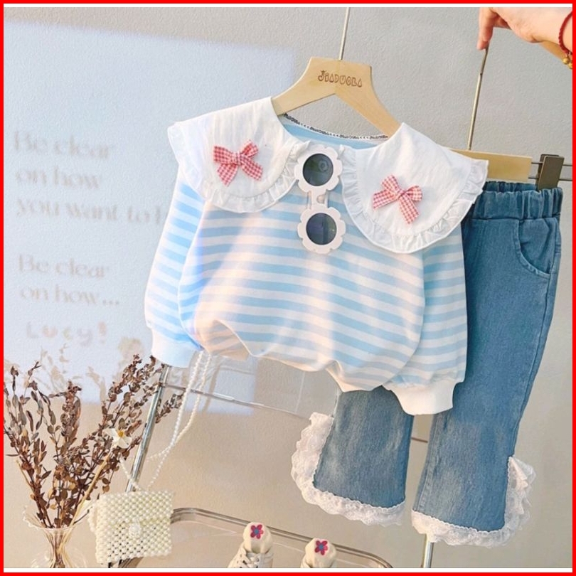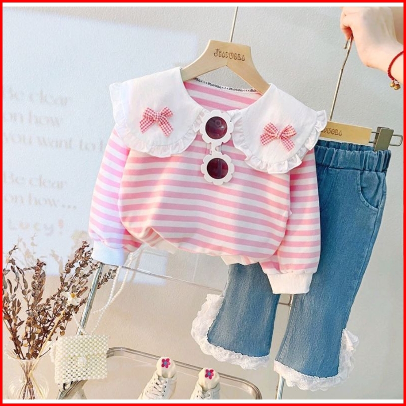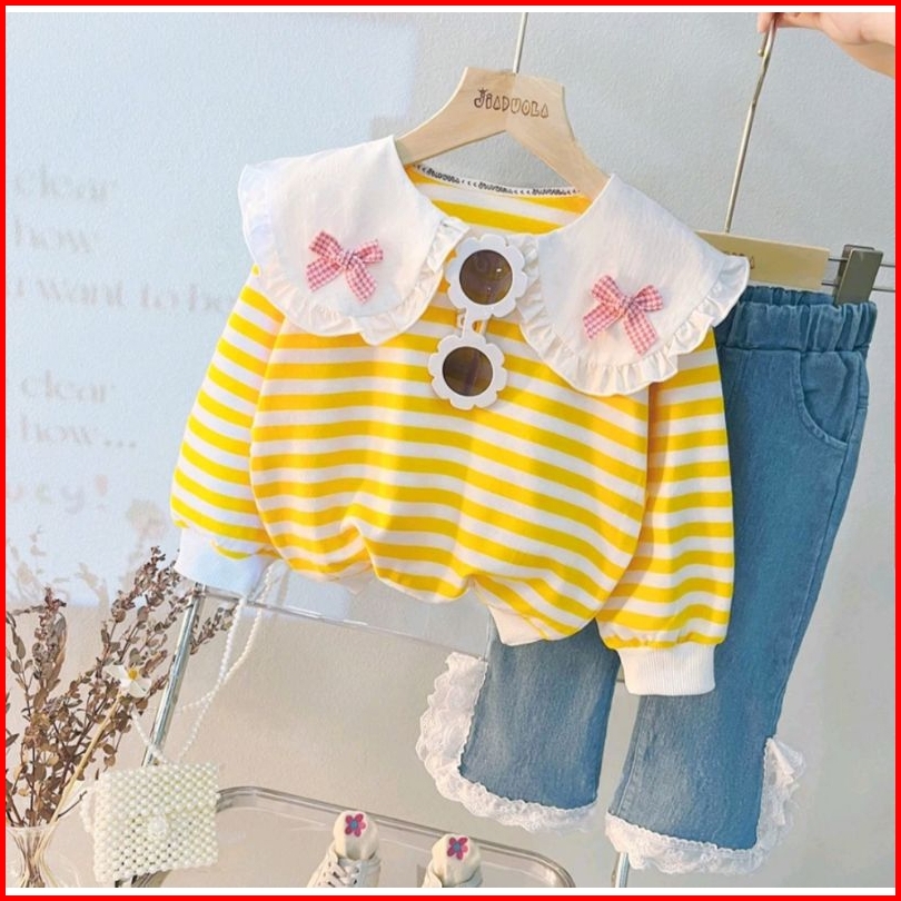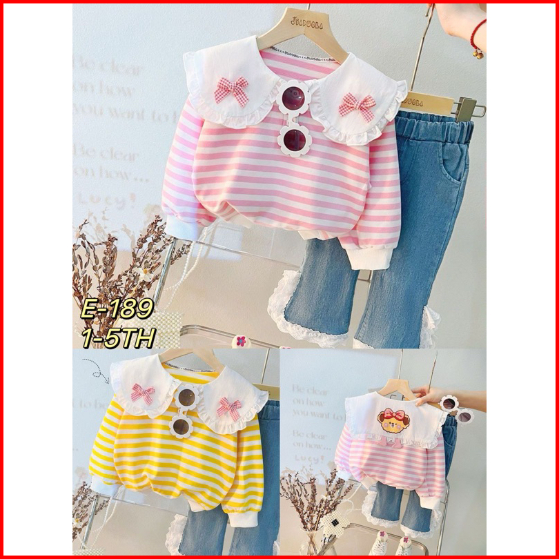 Setelan Anak Perempuan 1tahun - 5tahun Setjins Panjang Anak Cewek Motif Stripe Belang Kaos Biru Pink Kuning Celana Cutbr