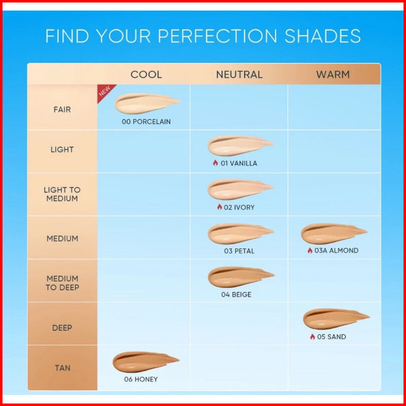 *01 Vanilla, *02 Ivory, *03 Petal, *00 Porcelain, *03 A Almond, *05 Sand, *04 Beige, *06 Honey