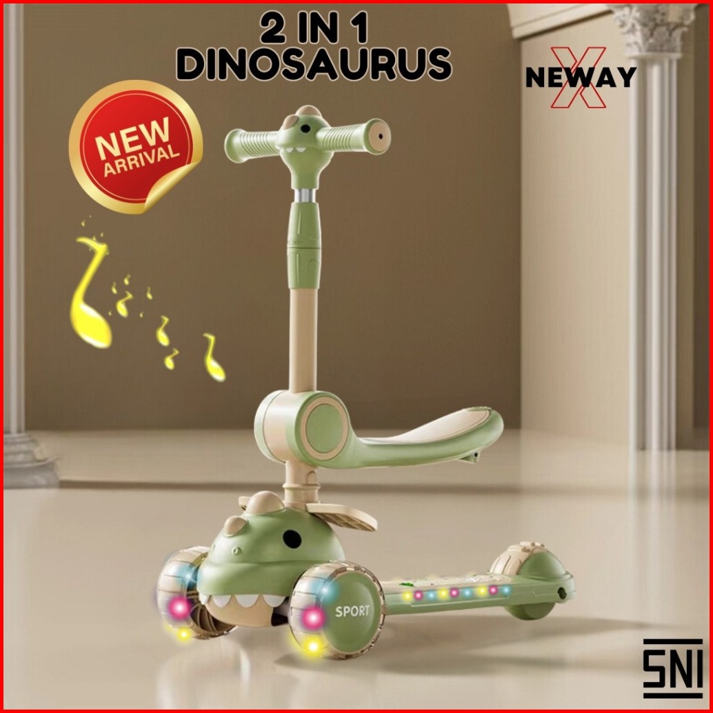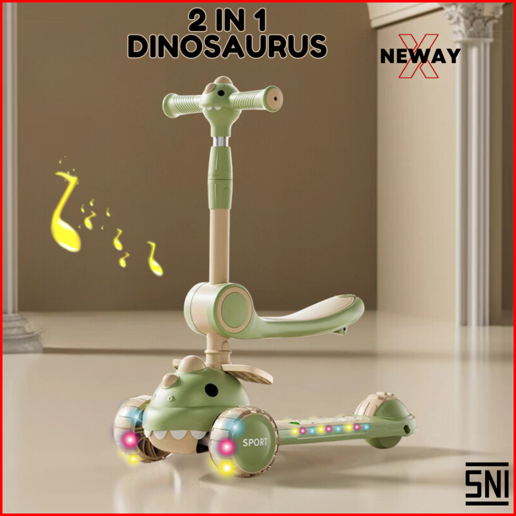Scooter Mainan Anak 2in1 Dino Footstep Skuter Lipat Duduk Roda Tiga Otoped Injakan Dinosaurus Toys