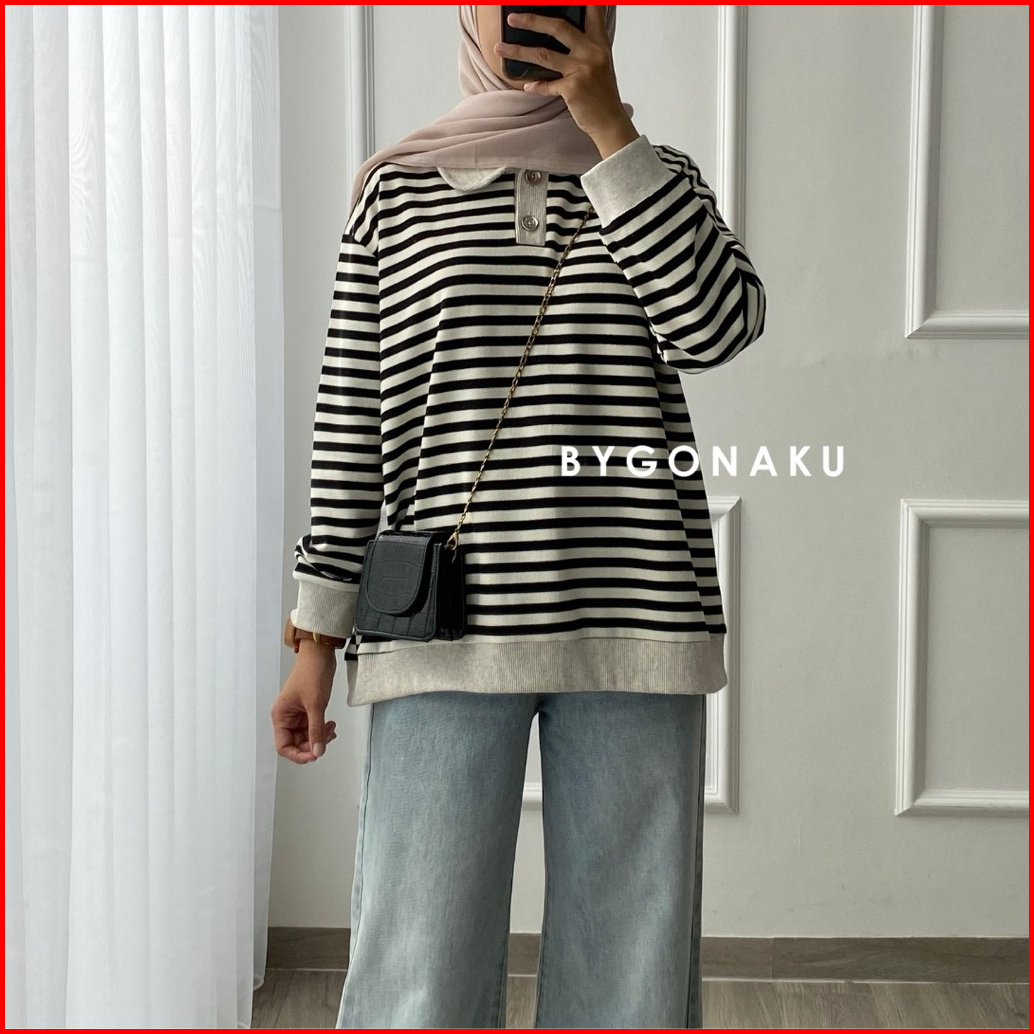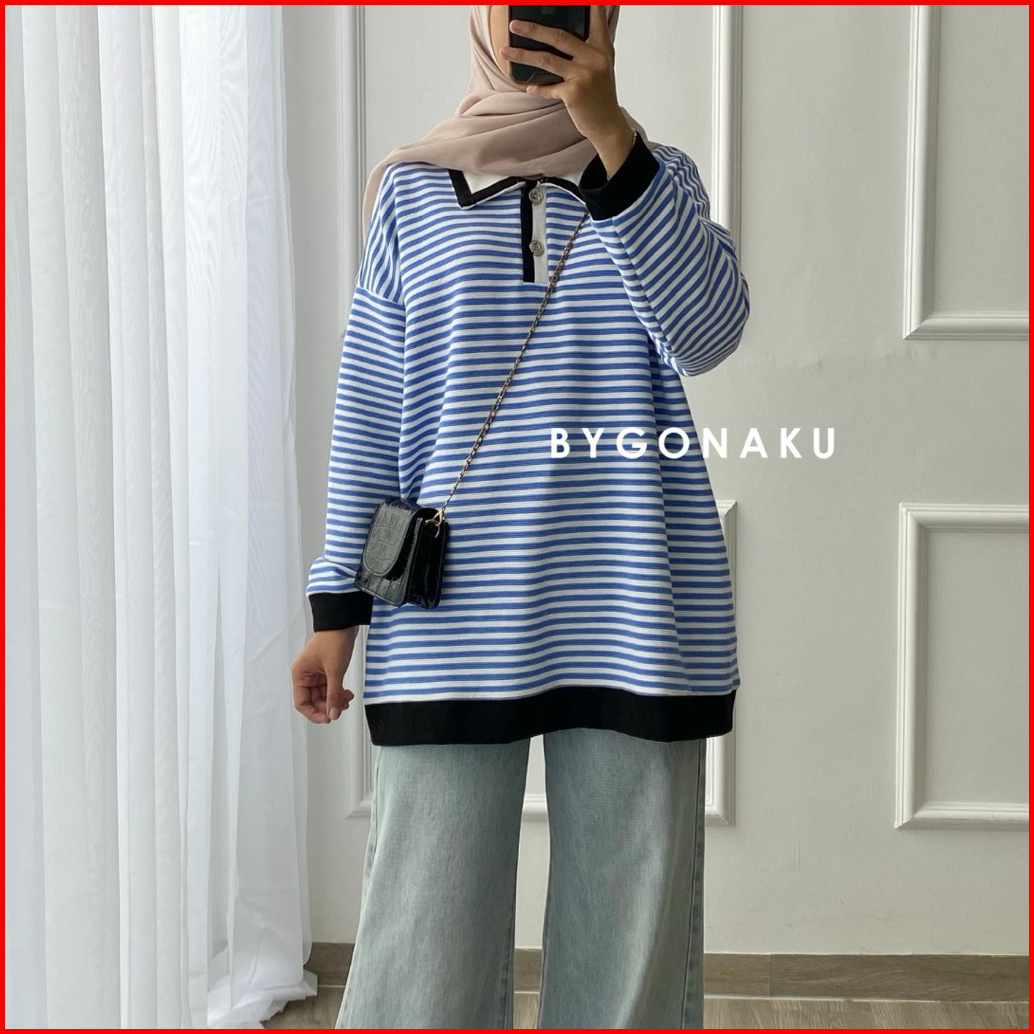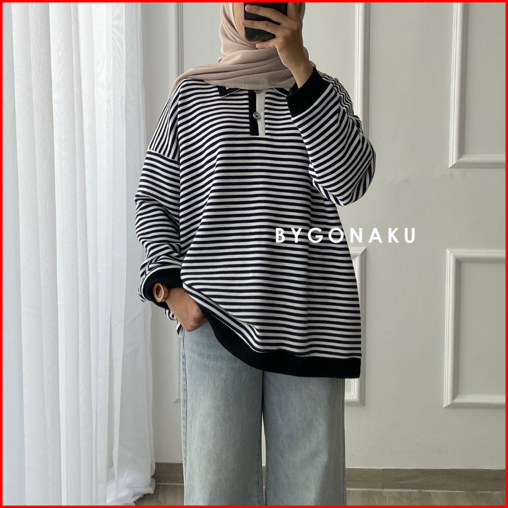 Gonaku Cirly Blouse Stripes Oversized Shirt Busui Friendly Kemeja Kerah Stripes Atasan Bigsize Jumbo Baju Kuliah Kerja