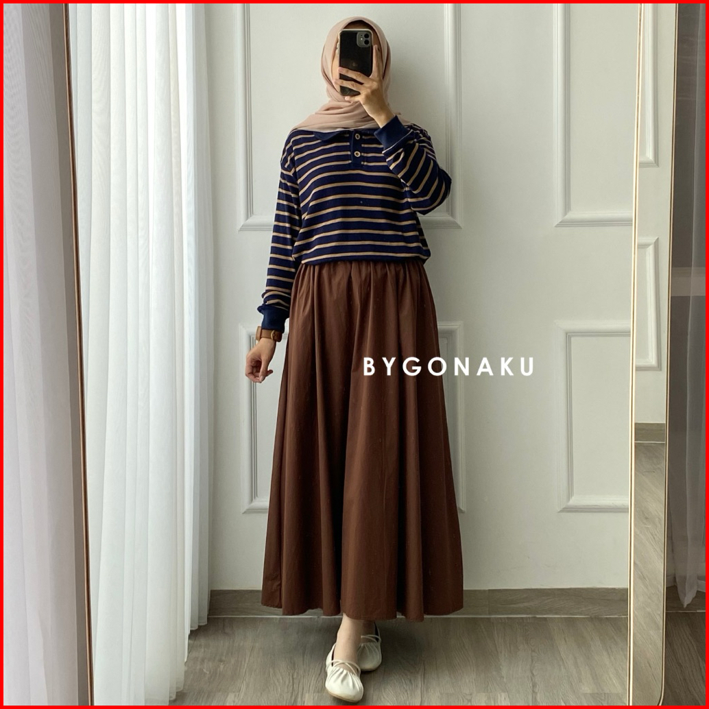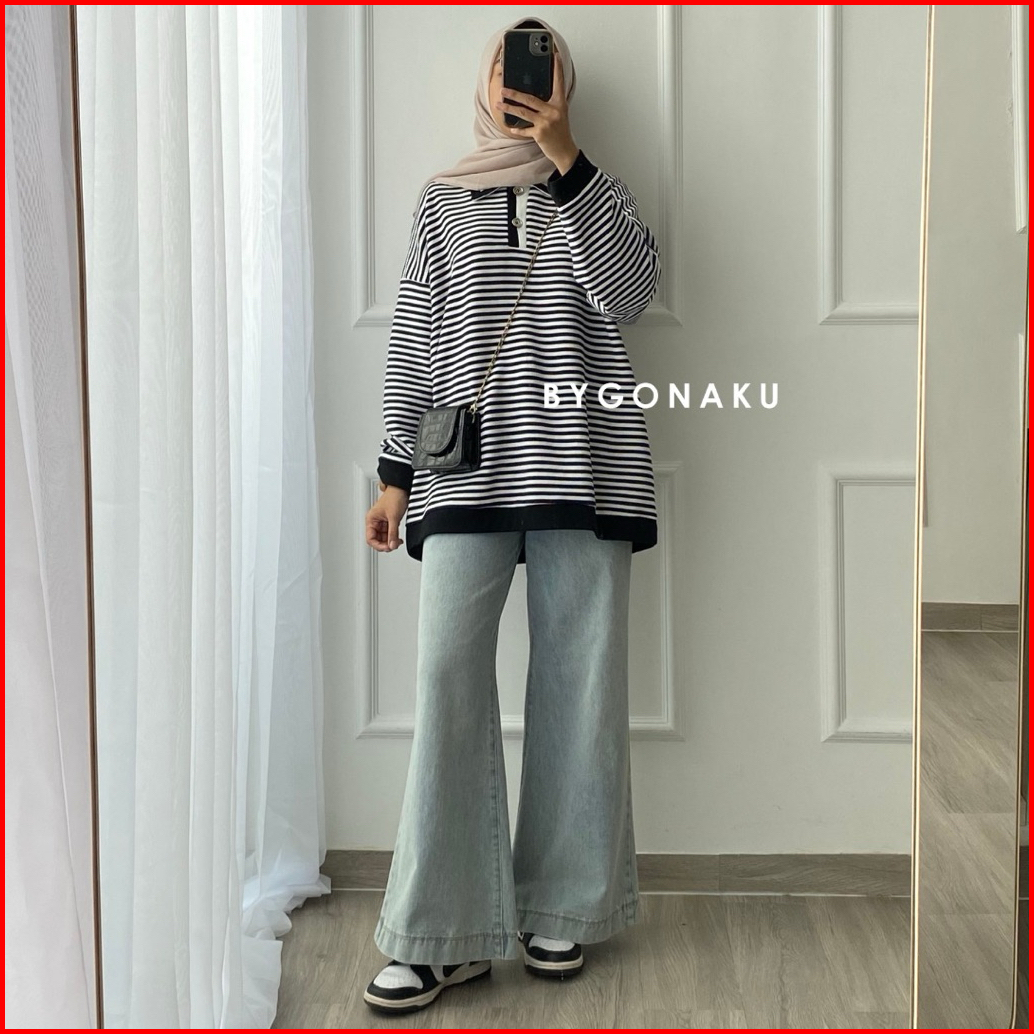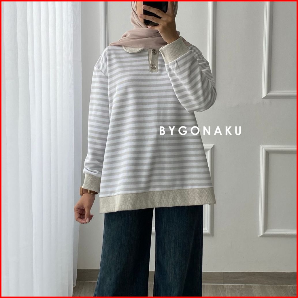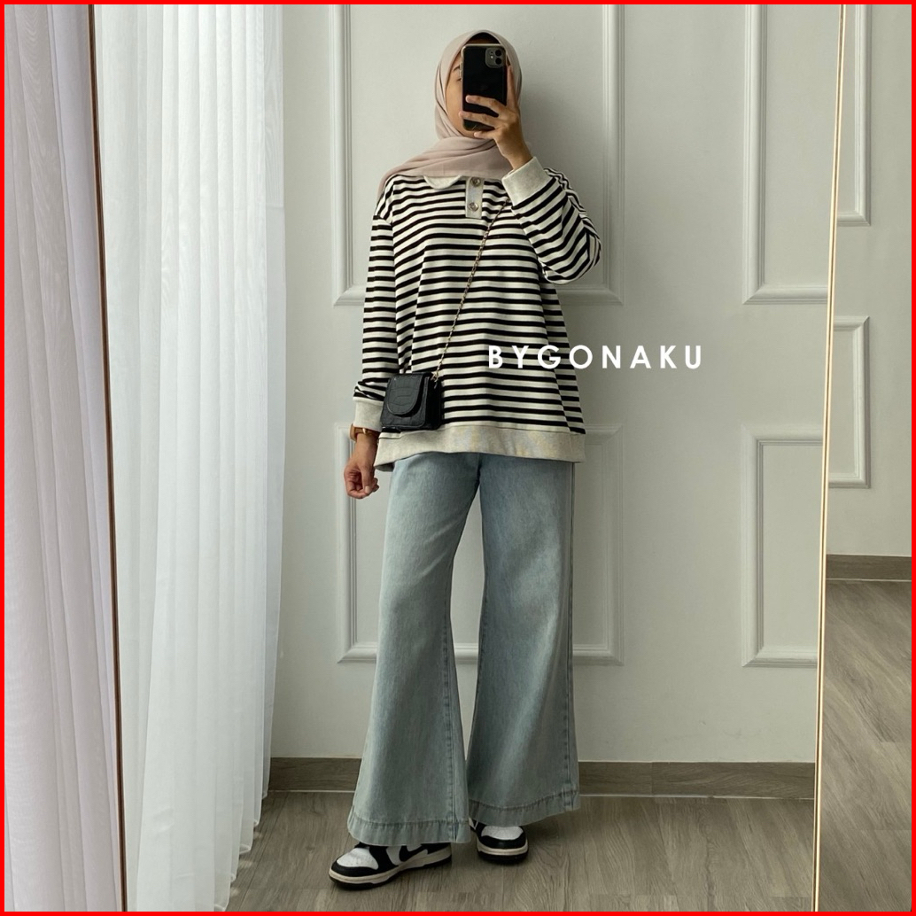 Gonaku Cirly Blouse Stripes Oversized Shirt Busui Friendly Kemeja Kerah Stripes Atasan Bigsize Jumbo Baju Kuliah Kerja