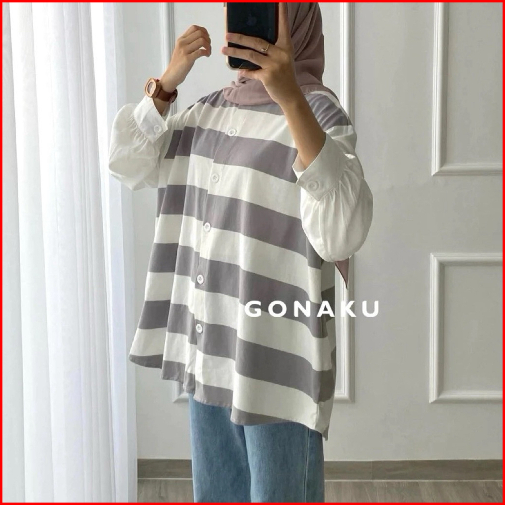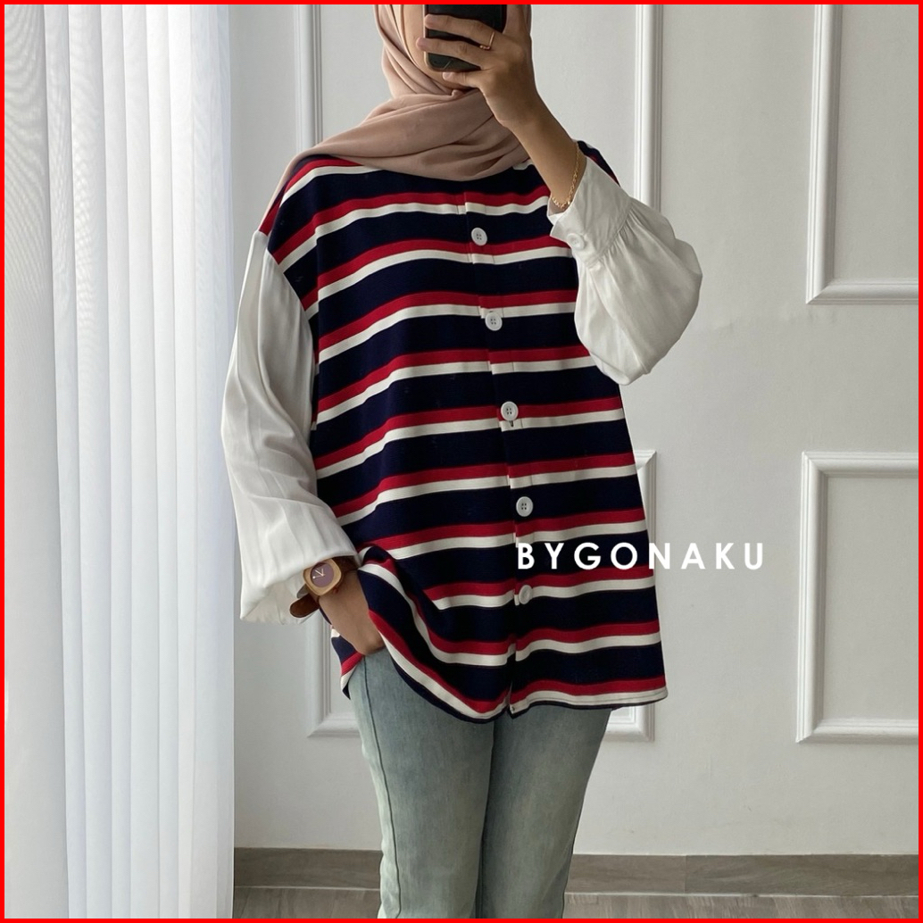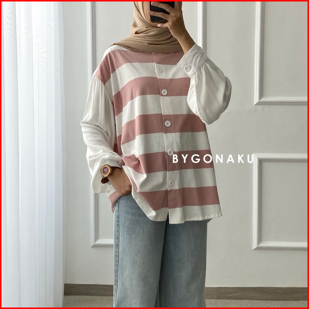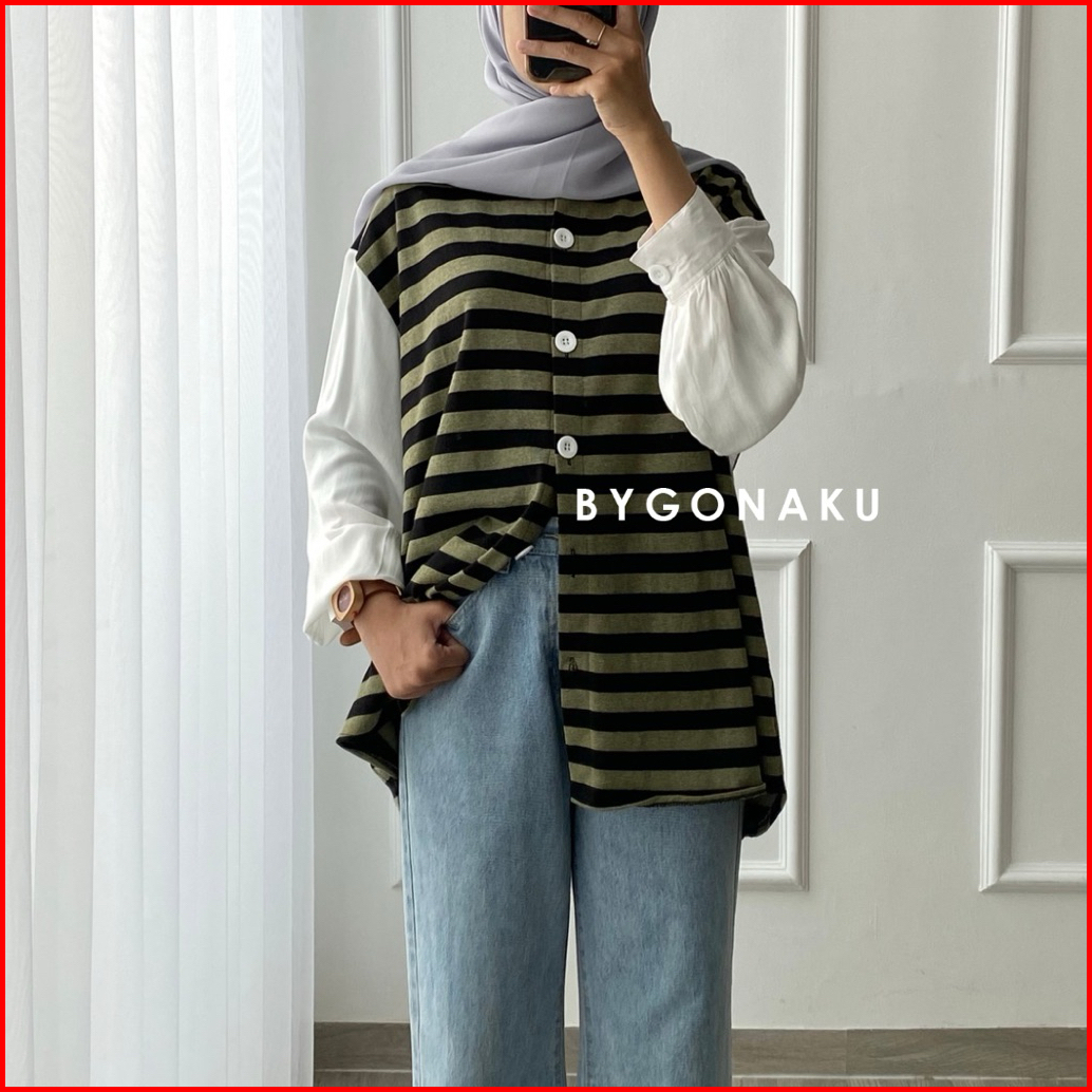 Gonaku Milly Button Stripes Blouse Oversized Top Busui Basic Kaos Oblong Salur Atasan Wanita Jumbo Bumil
