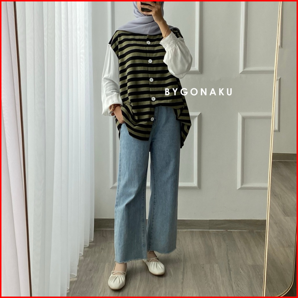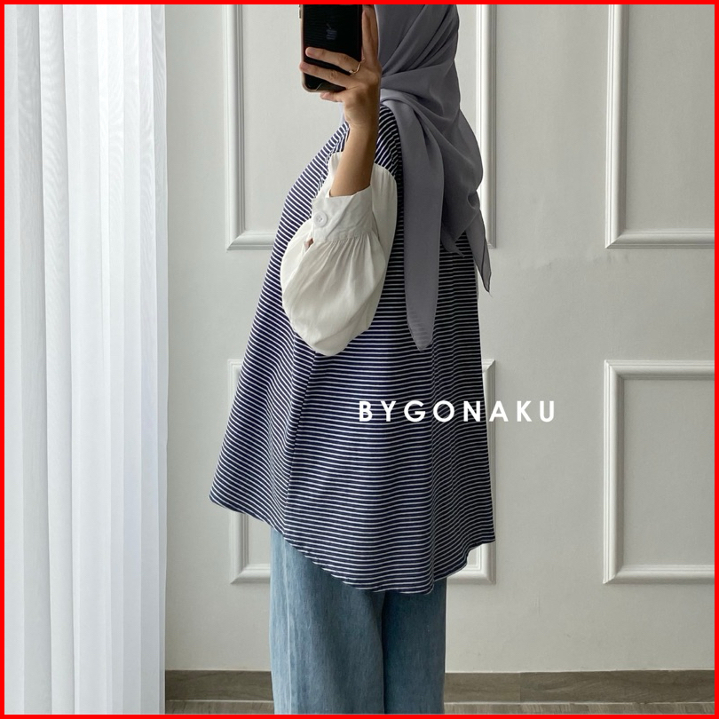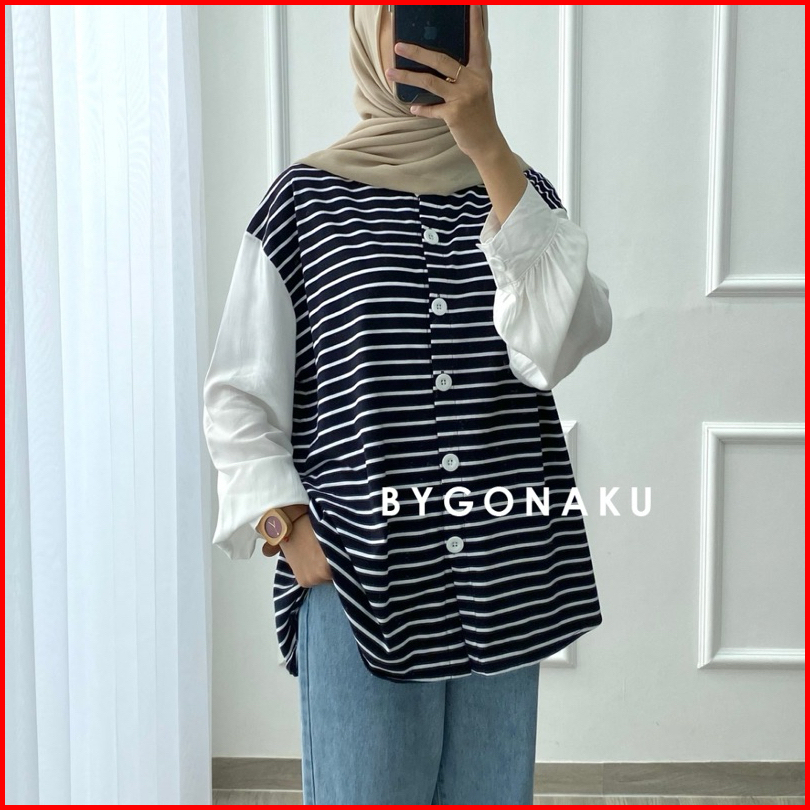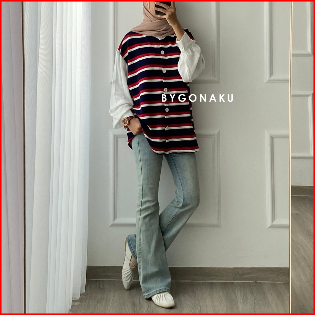 Gonaku Milly Button Stripes Blouse Oversized Top Busui Basic Kaos Oblong Salur Atasan Wanita Jumbo Bumil