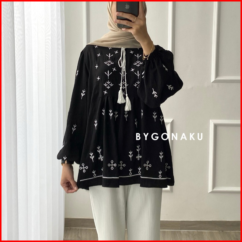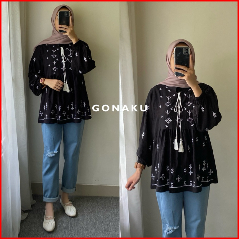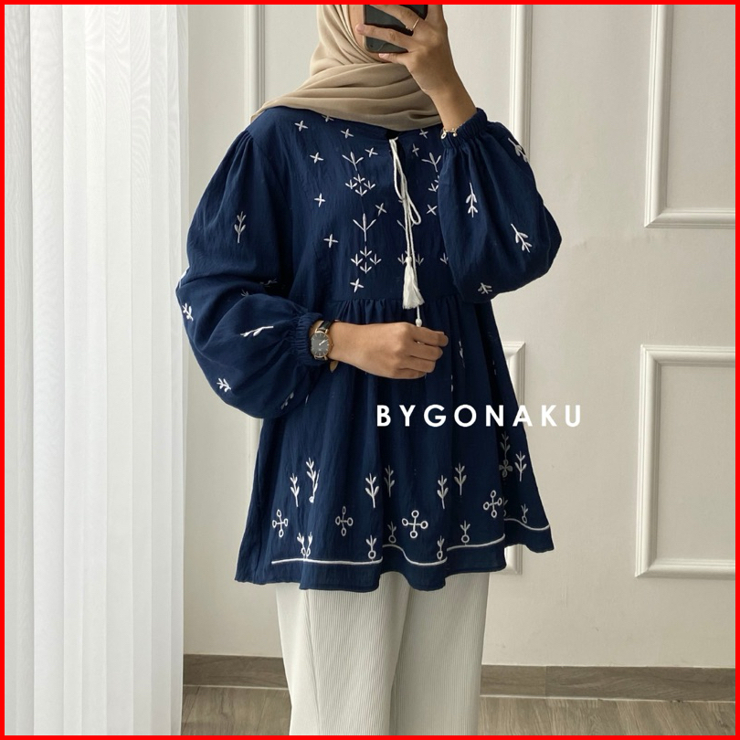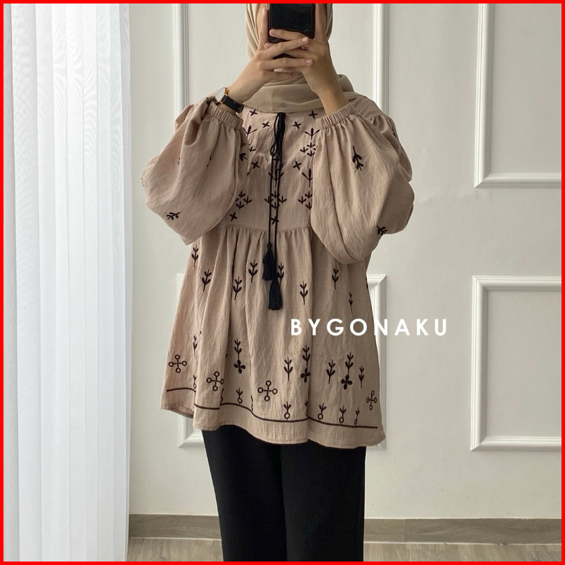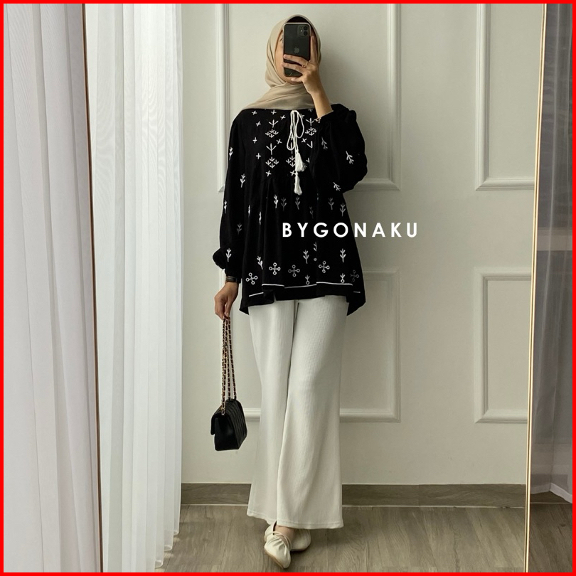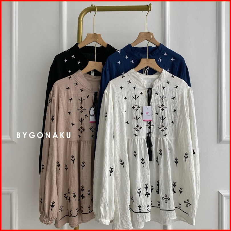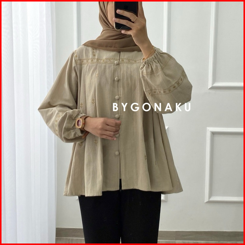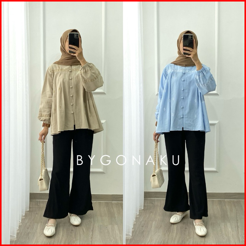 Gonaku Sophia Basic Oversized Shirt Busui Kemeja Linen Bordir Kemeja Wanita Baju Kerja Kuliah