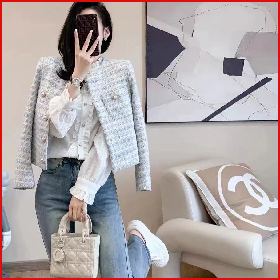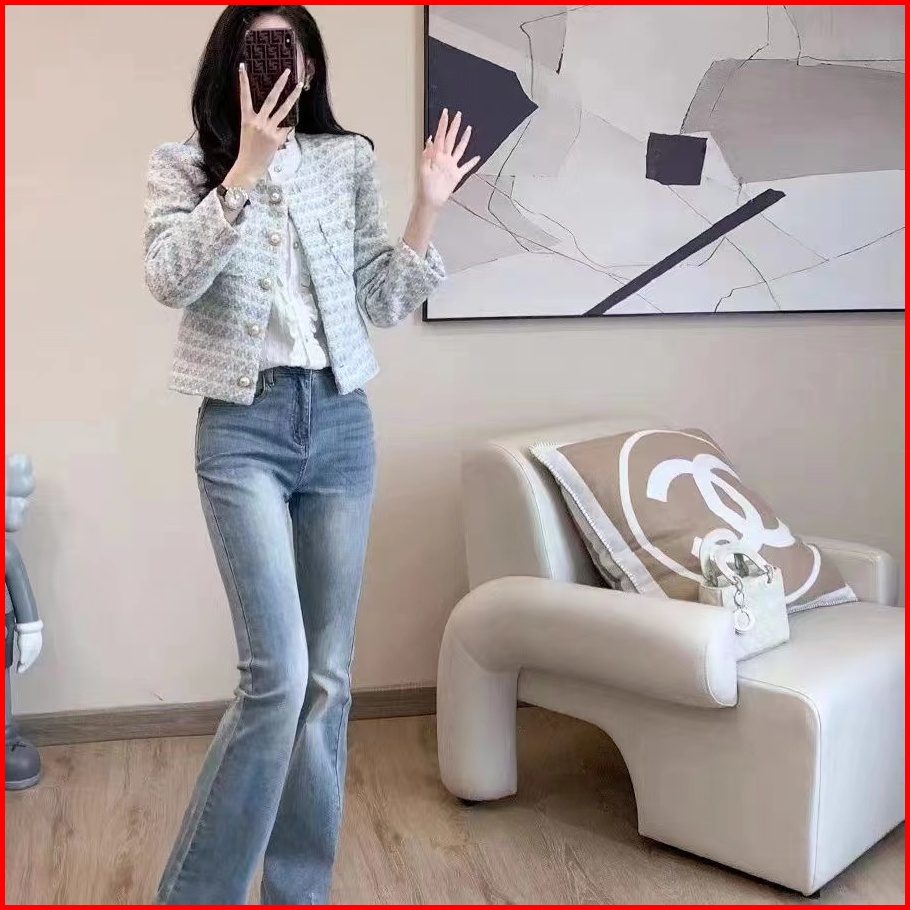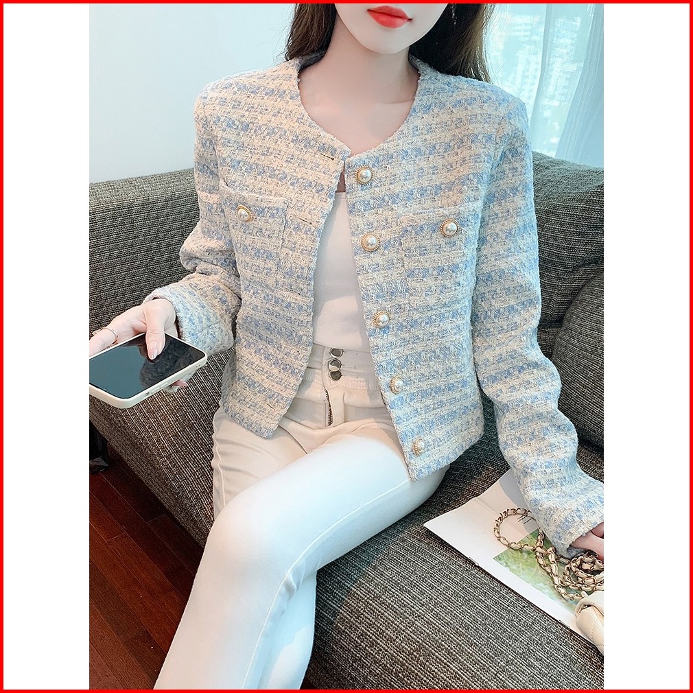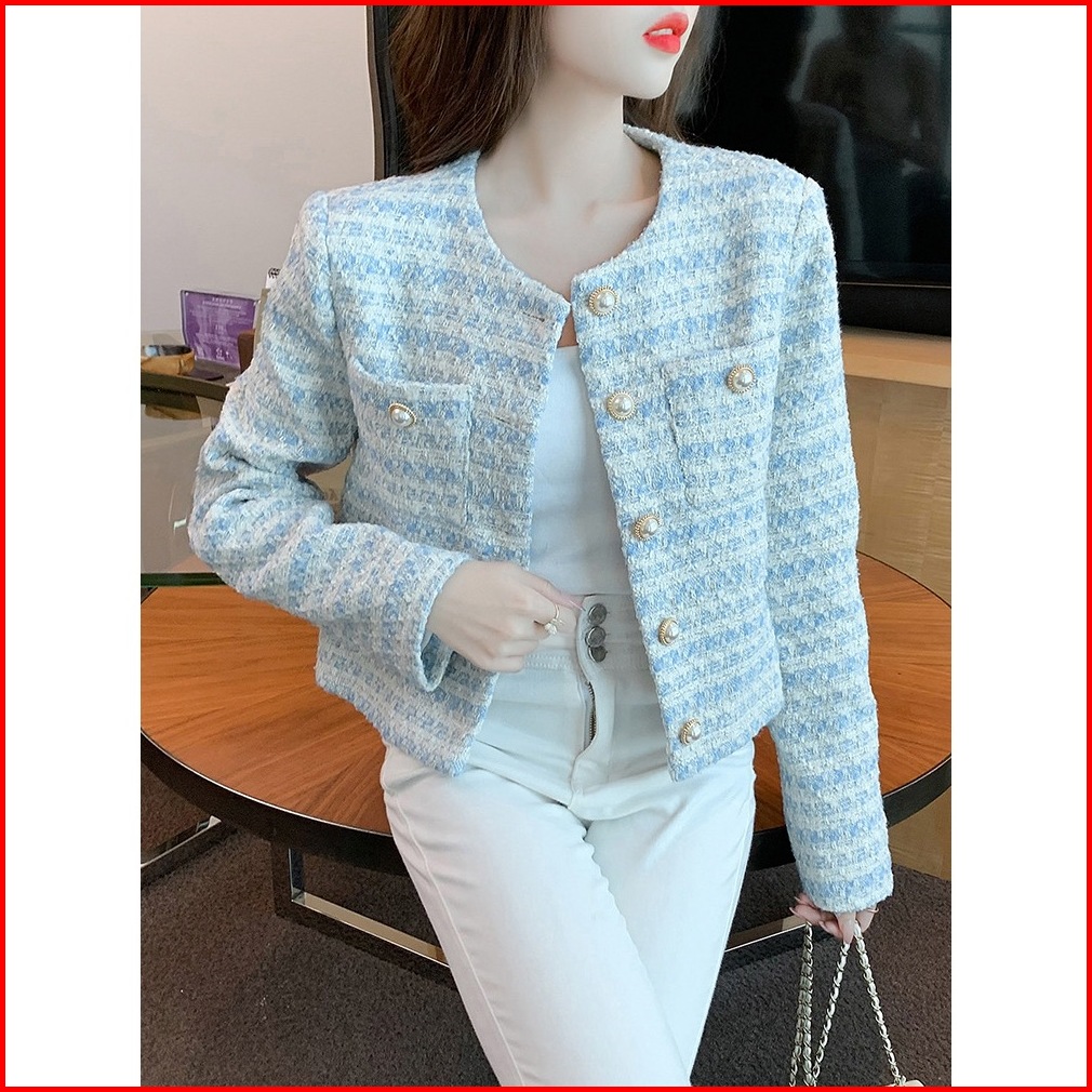 Blazer Biru Tweed Blazer Wanita Crop Top Korean Style M601