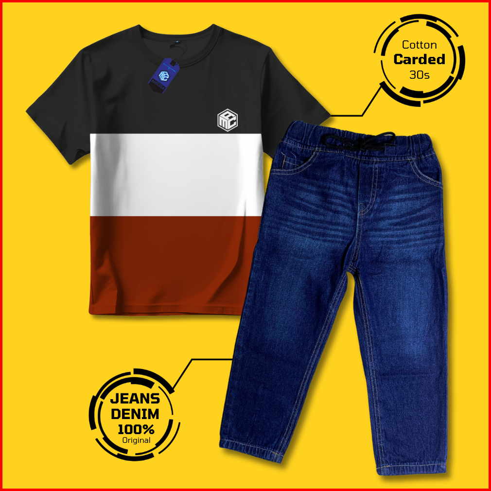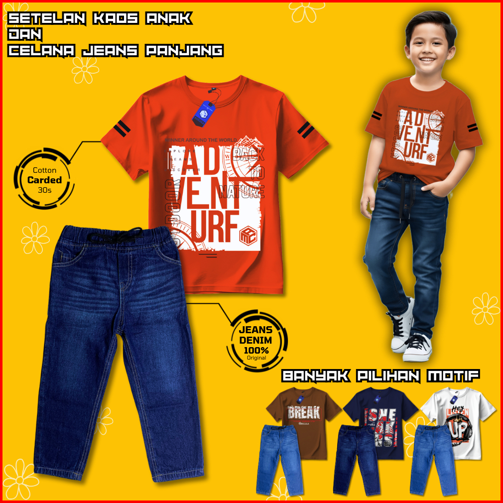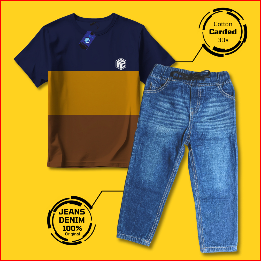 Setelan Anak Laki Laki Premium Kaos Anak Distro Katun 30s Tebal Lembut Celana Jeans Anak Panjang
