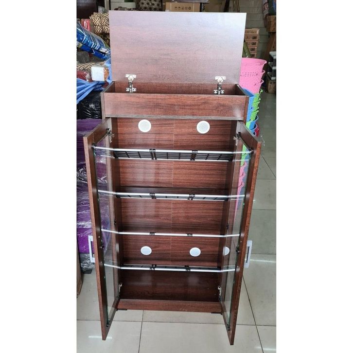 RAK SEPATU KACA KAYU MINIMALIS 15 PASANG DENGAN RAK PENYIMPANAN SERBAGUNA