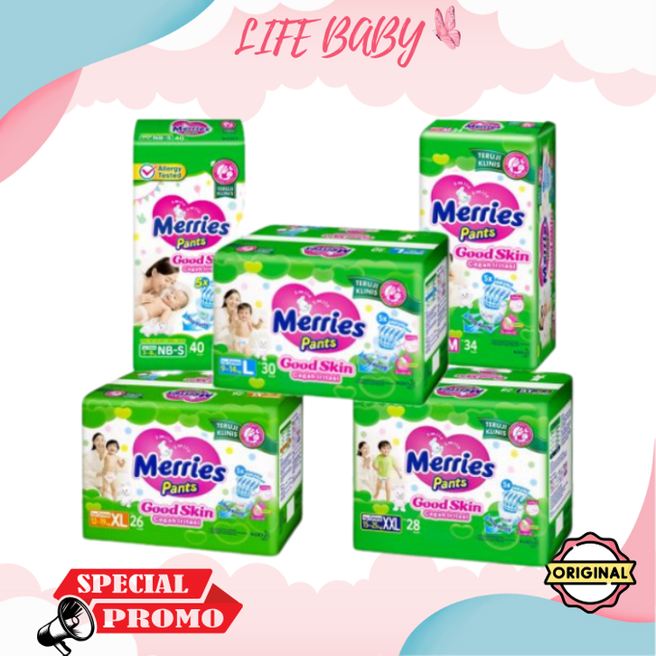 POPOK MERRIES GOOD SKIN PANTS CELANA DIAPERS BAYI ANAK M48 L42 XL38 XXL28 NB-S40 PAKET 2 BALL MURAH ORIGINAL TANPA DP