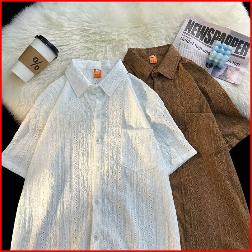 Hollow Rtero Vintage Japanese Summer Short Sleeve Comfortable Thin Shirt Casual Unisex In Brown Coklat And White Putih -