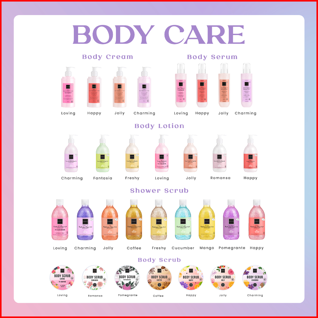 Scrub Loving, Scrub Pomegrante, Scrub Romansa, Scrub Coffee, Scrub Happy, Scrub Jolly, Scrub Charming, SS Loving, SS Charming, SS Jolly, SS Coffee, SS Freshy, SS Cucumber, SS Mango, SS Pomegrante, SS Happy, Lotion Loving, Loving Body Cream, Charming Body Cream, Jolly Body Cream, Happy Body Cream, Charming Body Serum, Happy Body Serum, Loving Body Serum, Jolly Body Serum, Lotion Tube Charming, Lotion Tube Jolly, BS Tube Charming, BS Tube Jolly, Jolly Scrub Booster