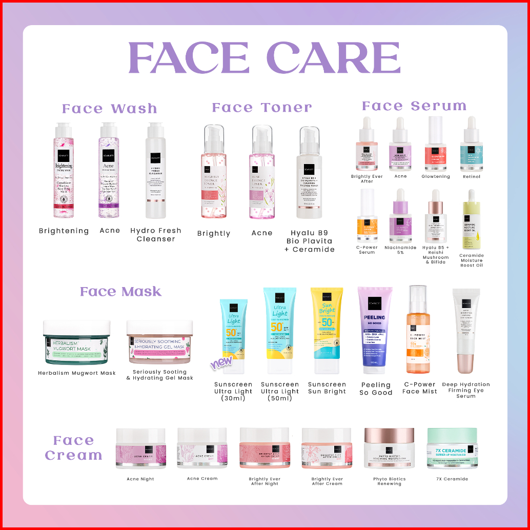Brightly Serum, Brightly Toner, Brightly Day Cream, Brightly Night Cream, Brightening FW, Acne Serum, Acne Toner, Acne Day Cream, Acne Night Cream, Acne Facial Wash, Hydro Cleanser, Hyalu B9 Toner, Hyalu B5 Serum, Eye Serum, Phyto Moisturizer, Gel Mask, Mugwort Mask, Niacinamide Serum, Retinol Serum, Glowtening Serum, C-Power Serum, C-Power Face Mist, Ceramide Boost Oil, Sunscreen UltraLight, Sunscreen SunBright, Peeling Gel, Ceramide Moisturizer