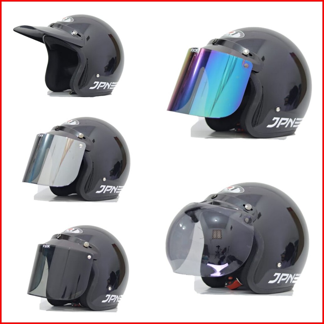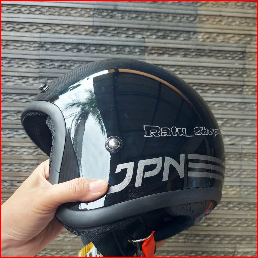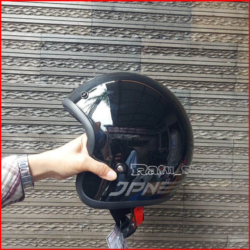 Helm Jpn Retro Hitam Glossy Paket Murah Kaca Datar Cembung