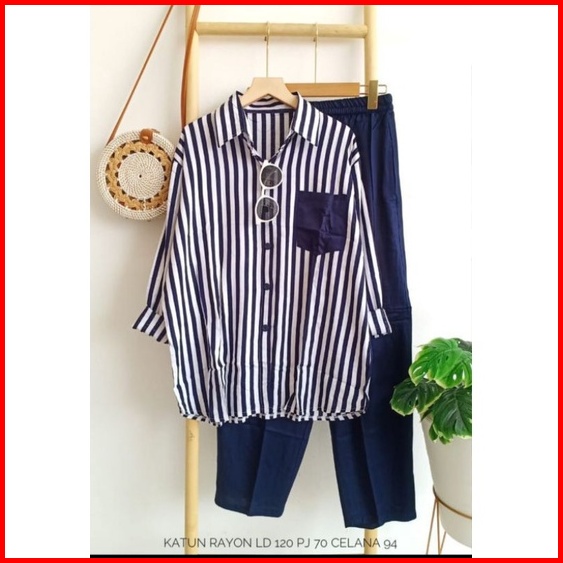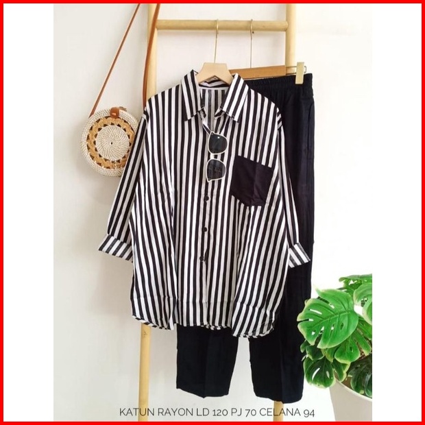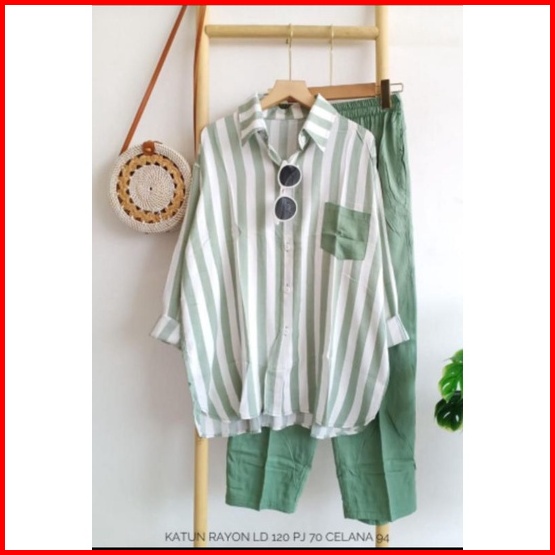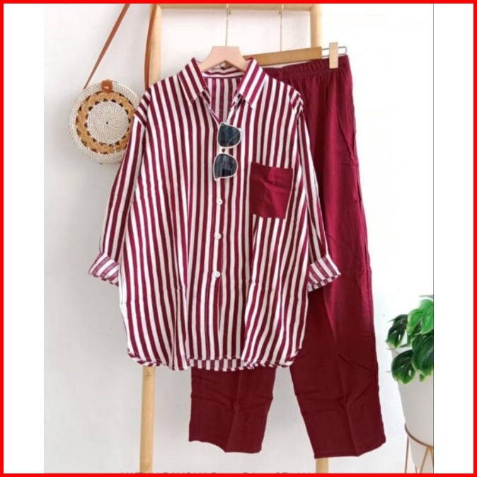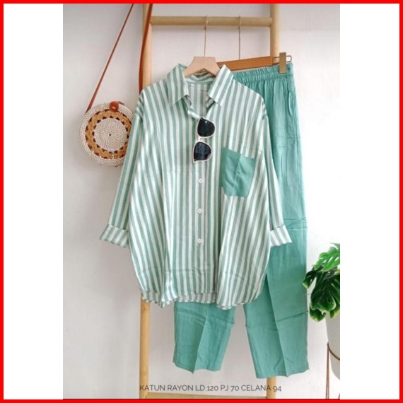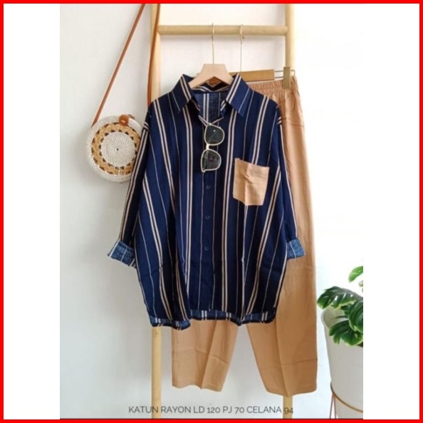 Stelan Panjang Salur Stelan Kemeja Wanita Lengan Panjang Salur Setcel Wanita Kekinian Oneset Daily Stelan Rayon Terbaru