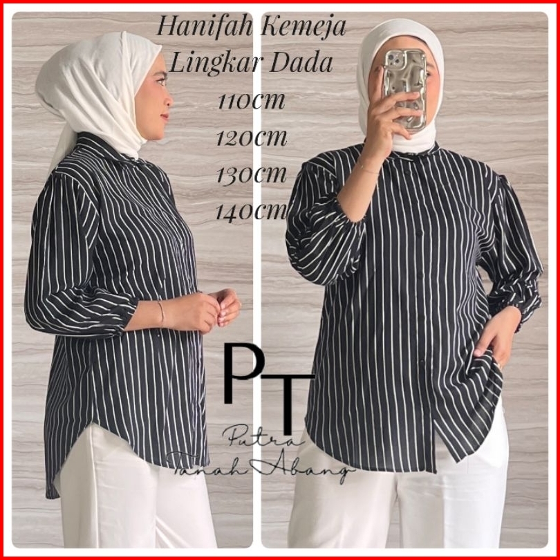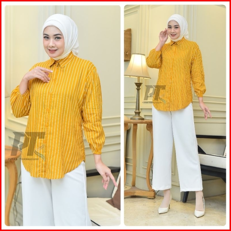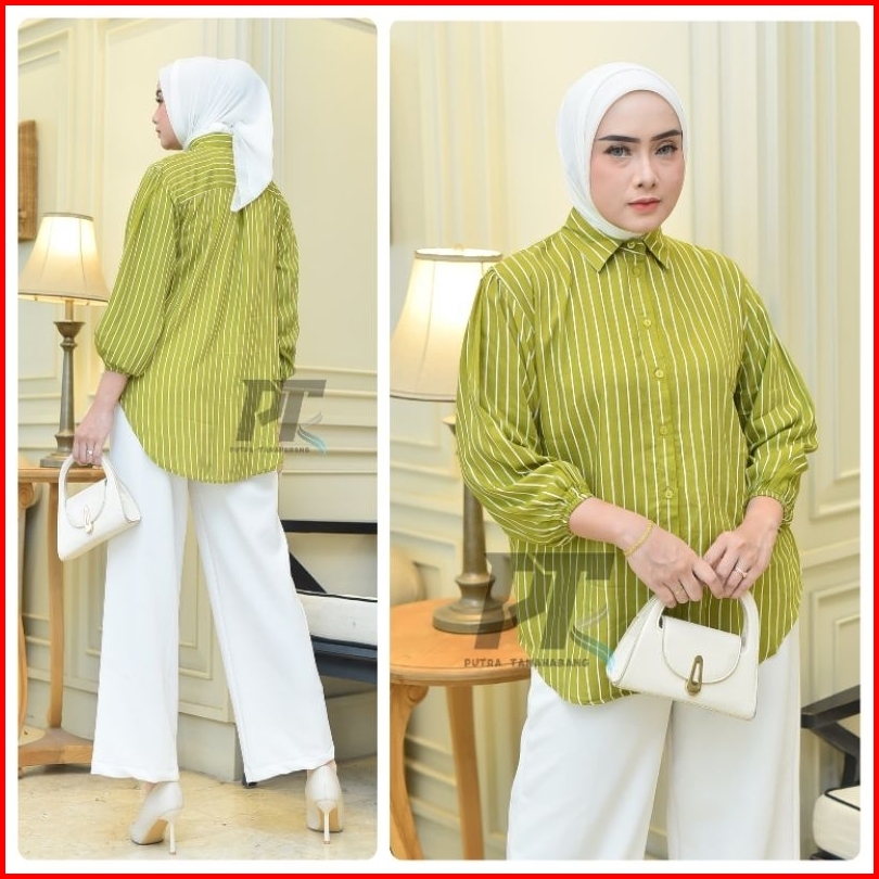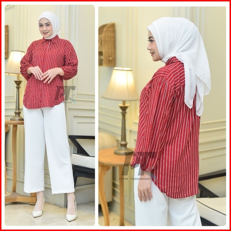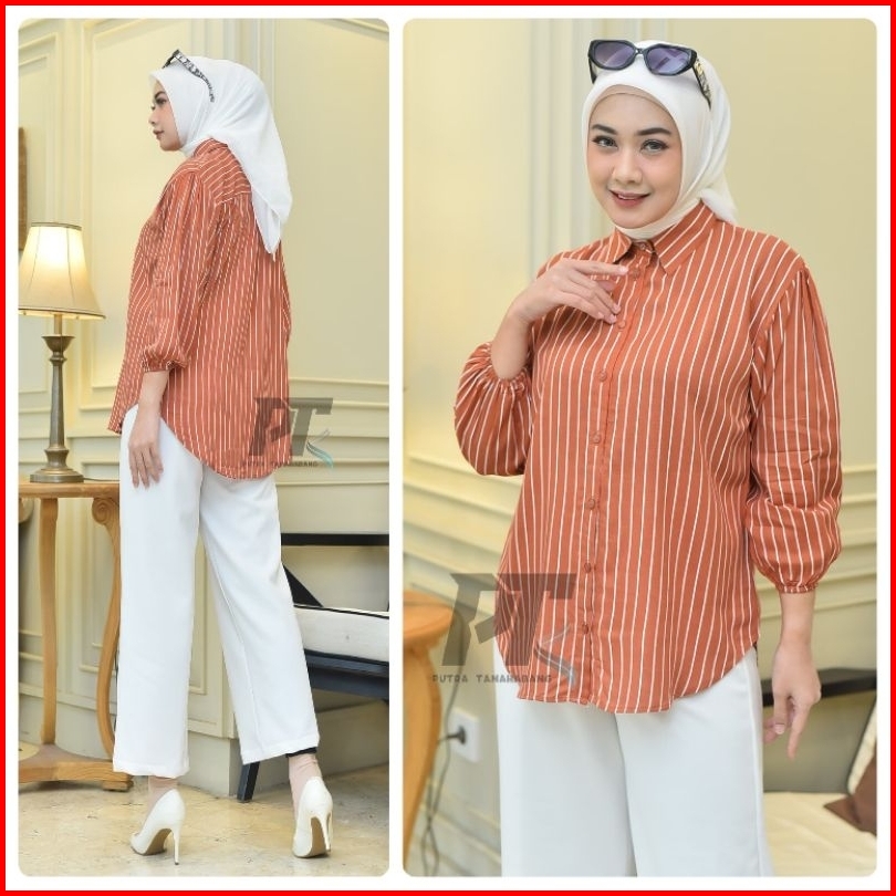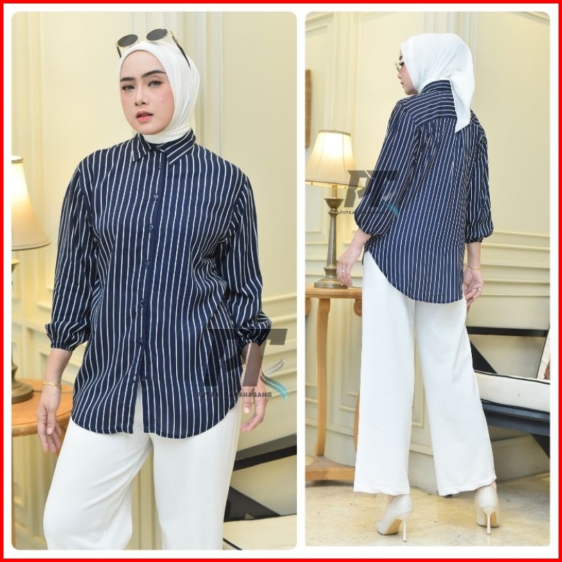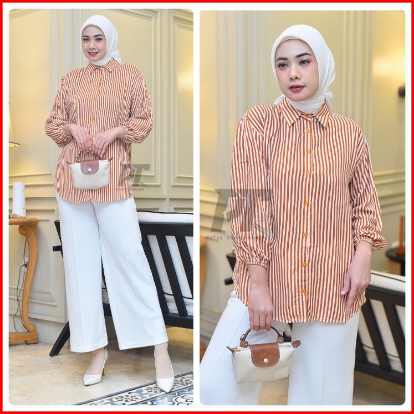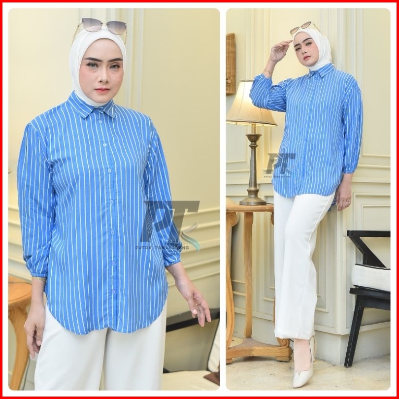 Atasan Pakaian Kemeja Rayon Motif Salur Garis-garis Baju Wanita Lengan Panjang Oversize