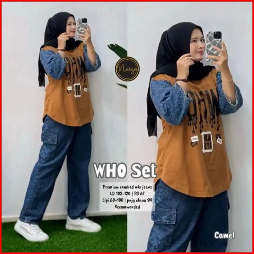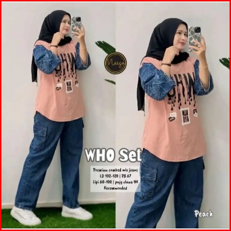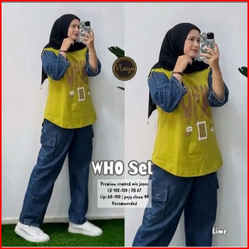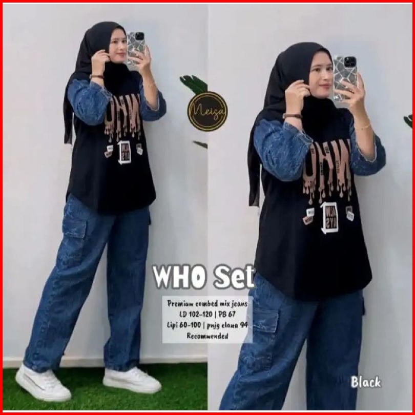 Setelan Wanita Jeans Kombinasi Combad Tangan