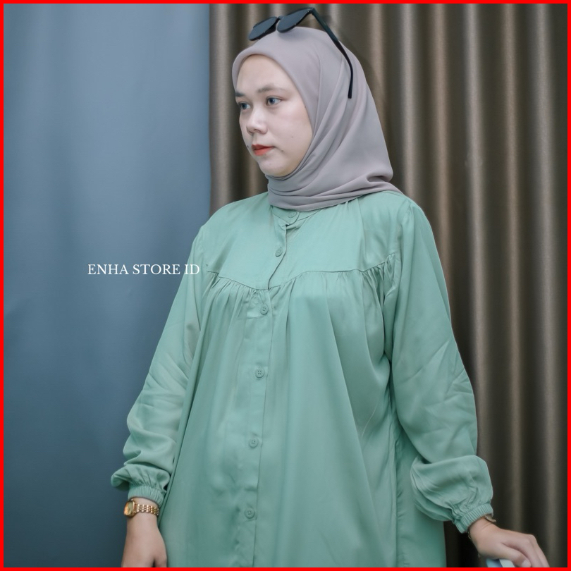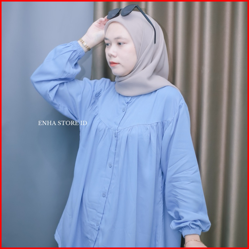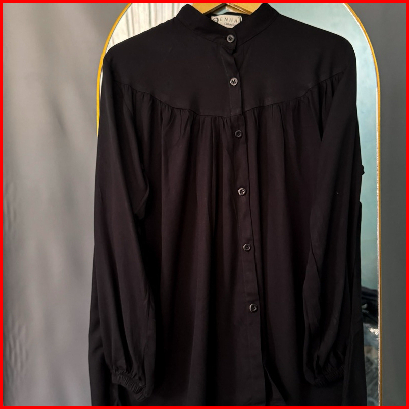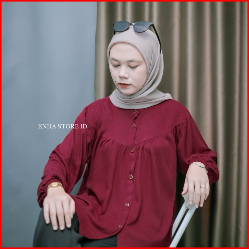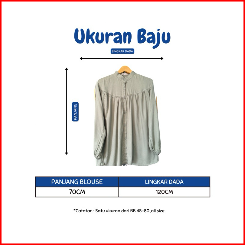 Blouse Wanita Rayon Twill Yerim Lengan Panjang Karet Kerah Shanghai Full Kancing Kemeja Casual