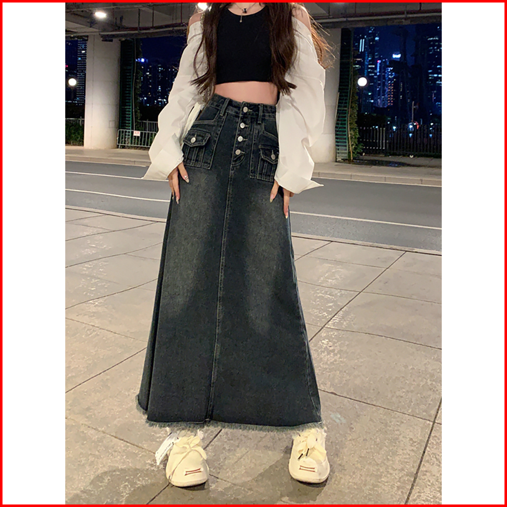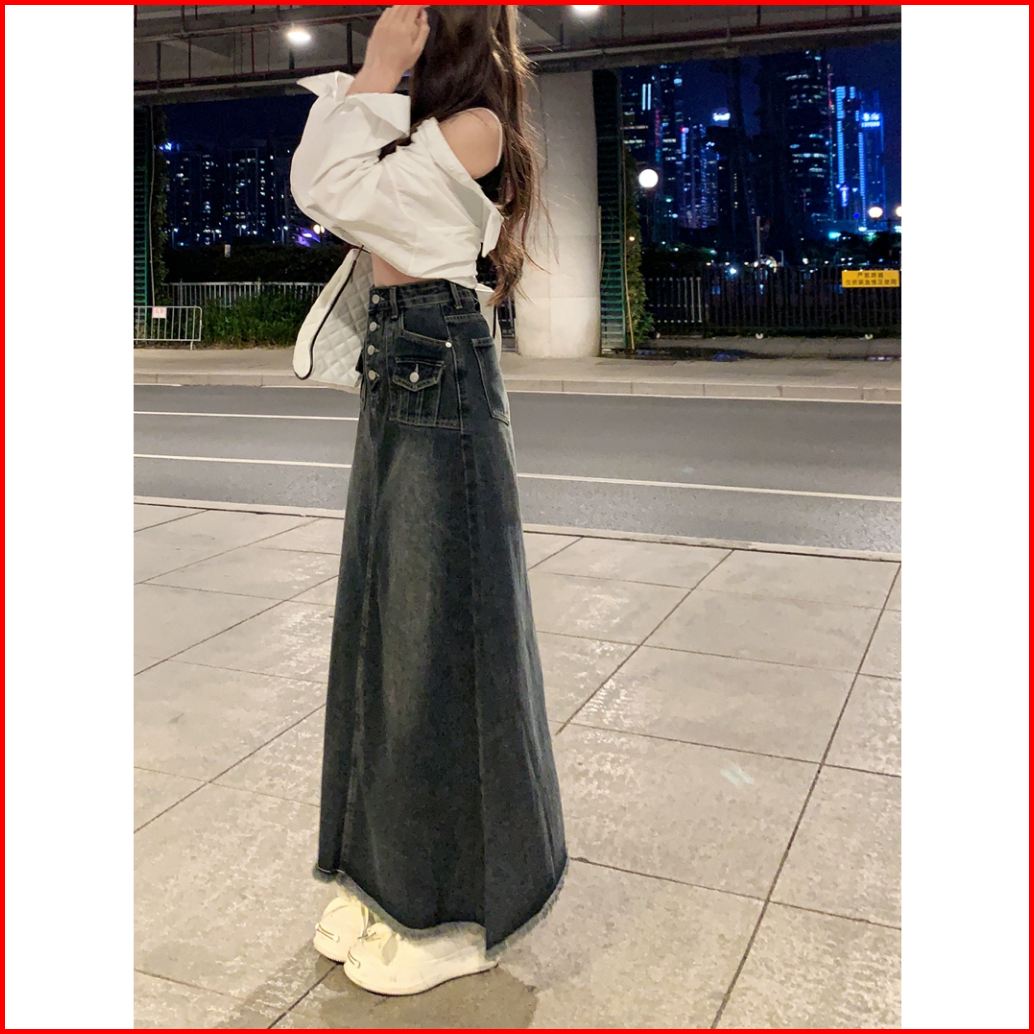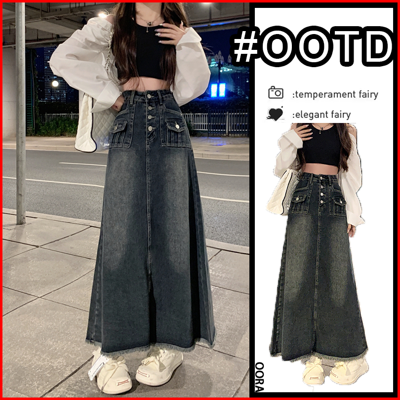 Oora Rok Denim High Waist Korean Style Untuk Wanita Rok Longgar Retro Baru Rok Panjang A-line Yang Melangsingkan Tepi Me