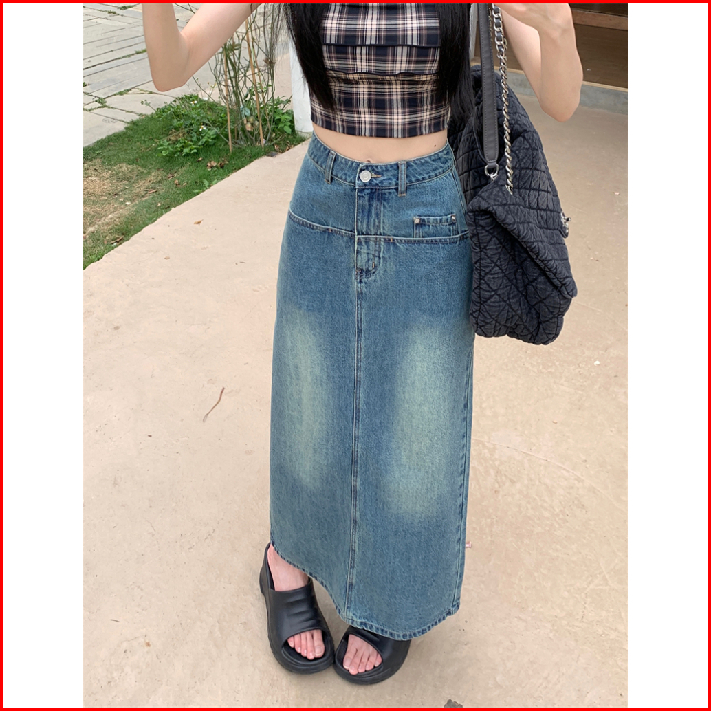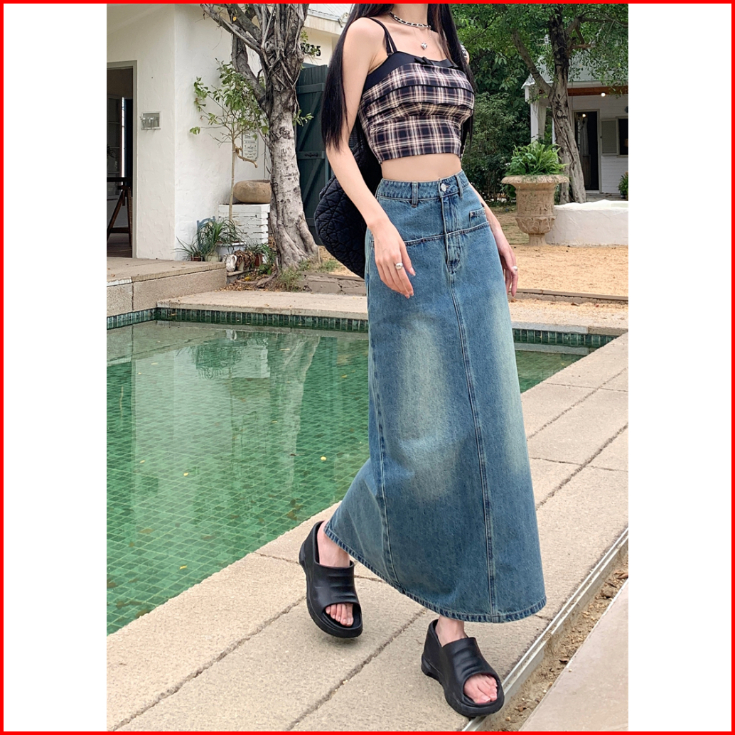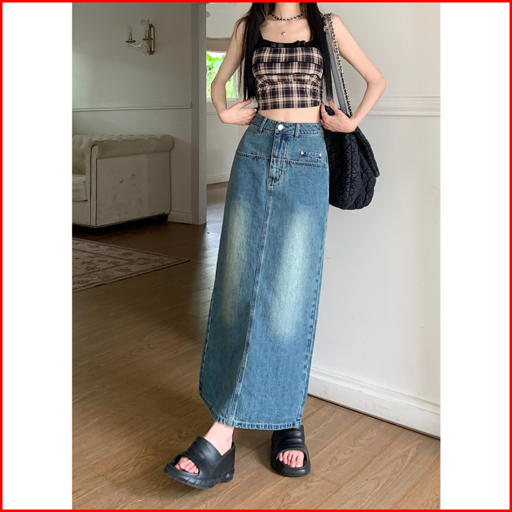 Xiaozhainv Korean Style Denim Rok Panjang Wanita Skirts Setengah High Waist Biru 0796