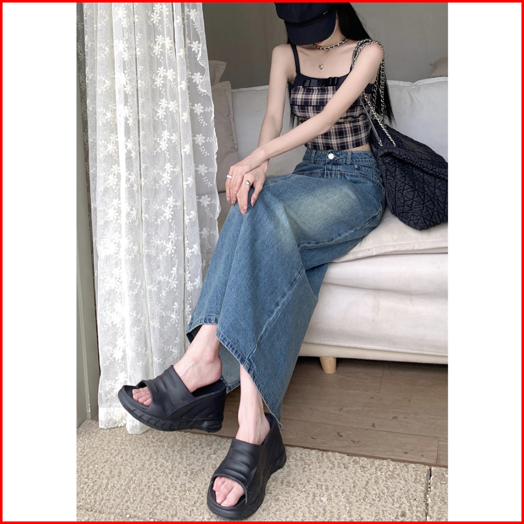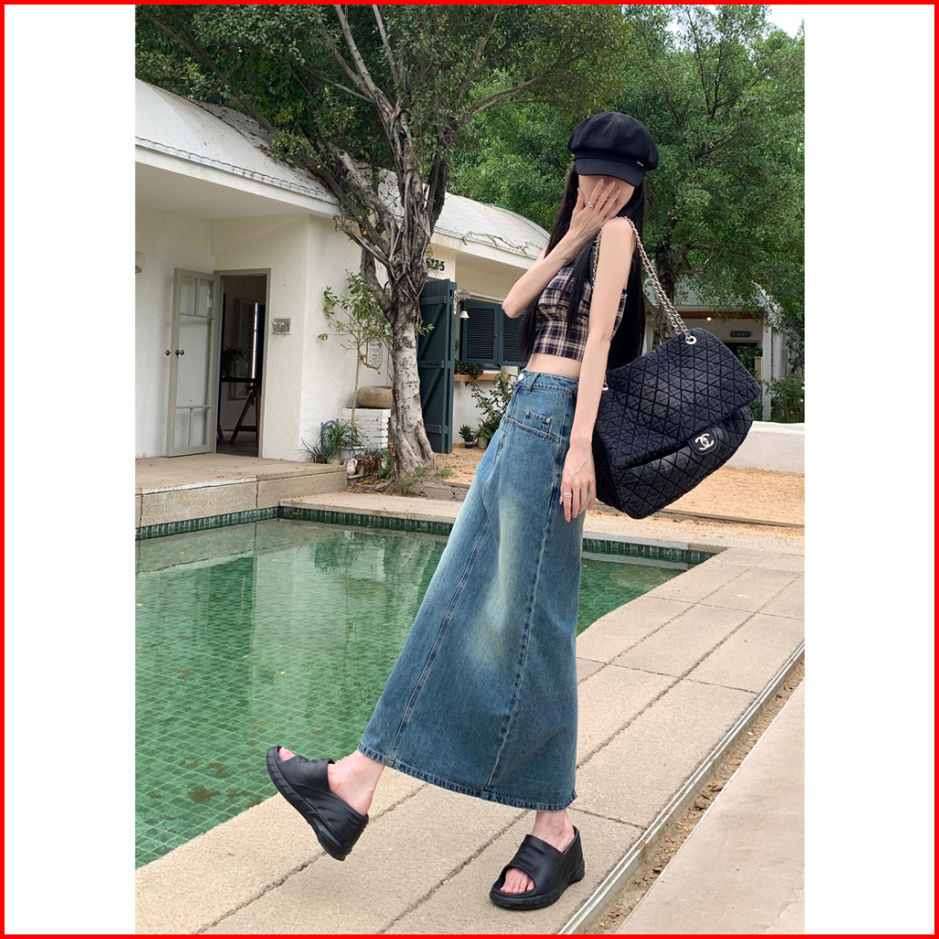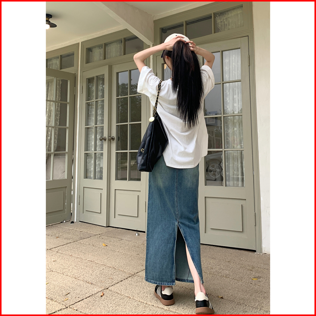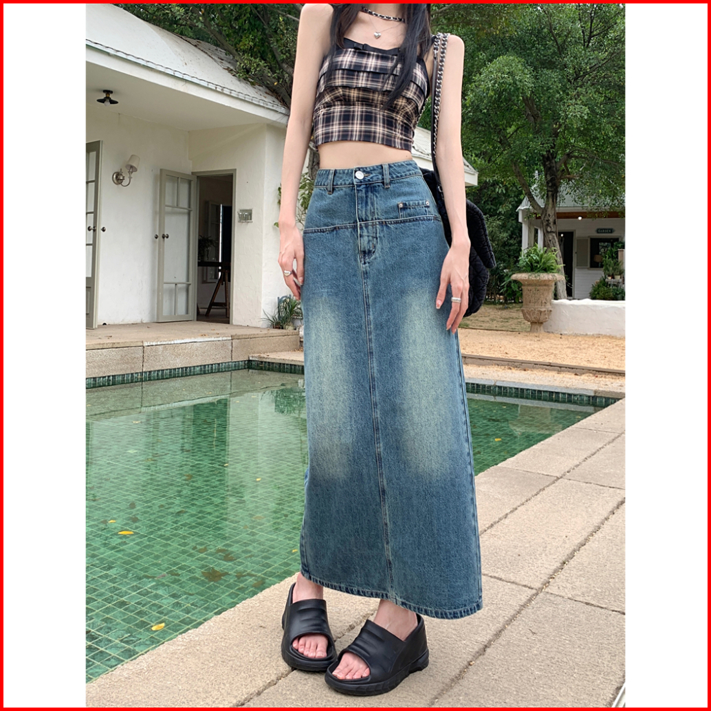 Xiaozhainv Korean Style Denim Rok Panjang Wanita Skirts Setengah High Waist Biru 0796