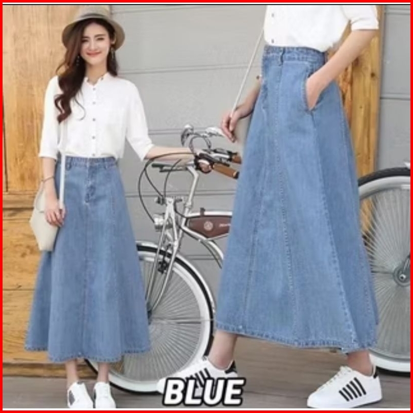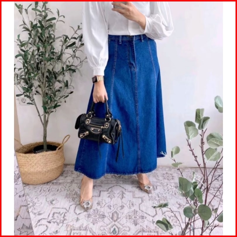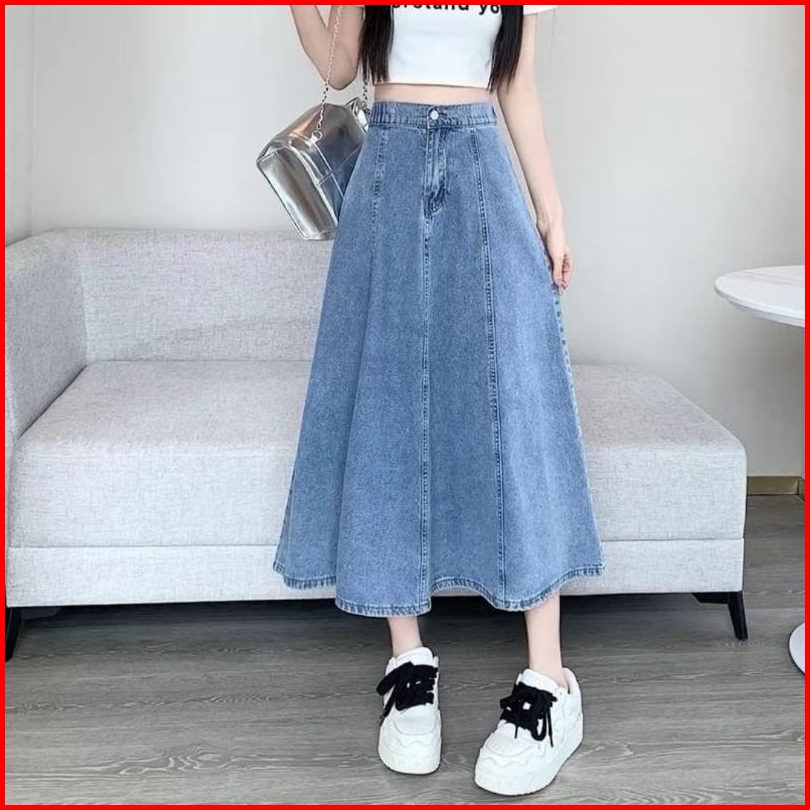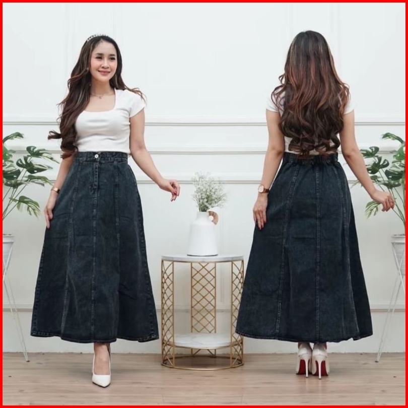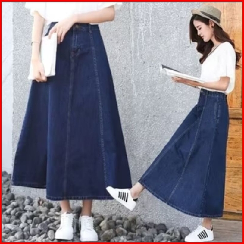 Jisoo Rok Jeans Mayung Premium Wanita A Linen 7 8 Model Payung Pinggang Karet Rok Wanita Hightwaist Rok Standar Jumbo Ko