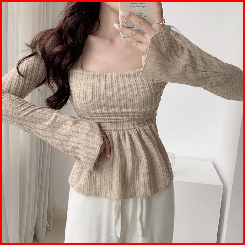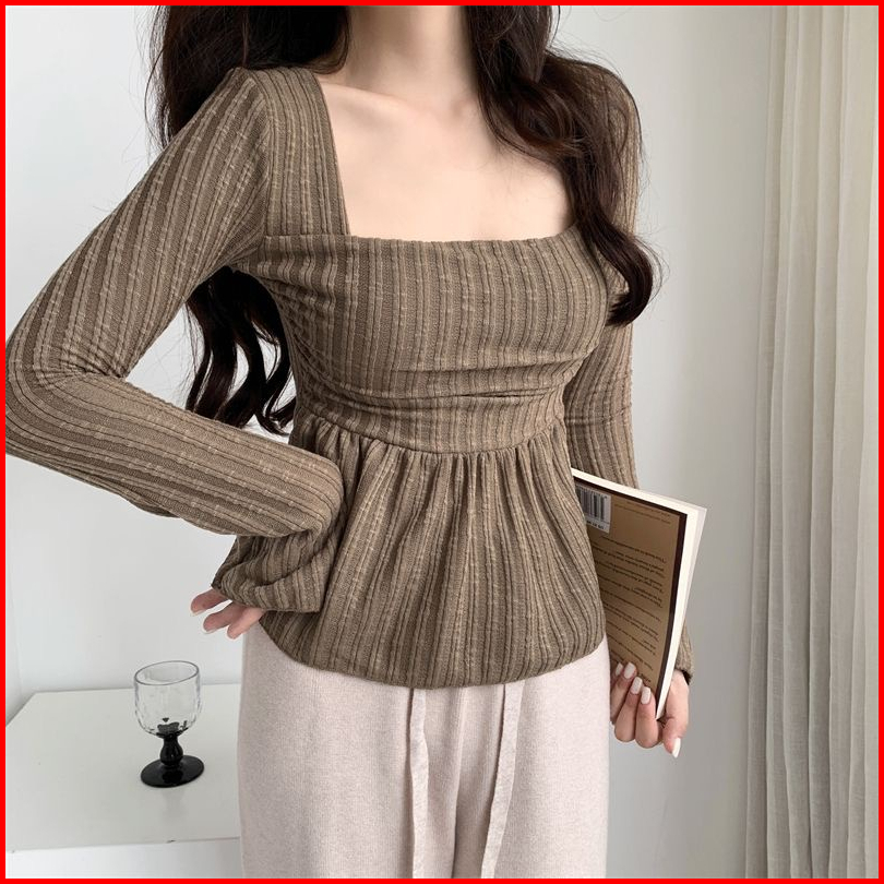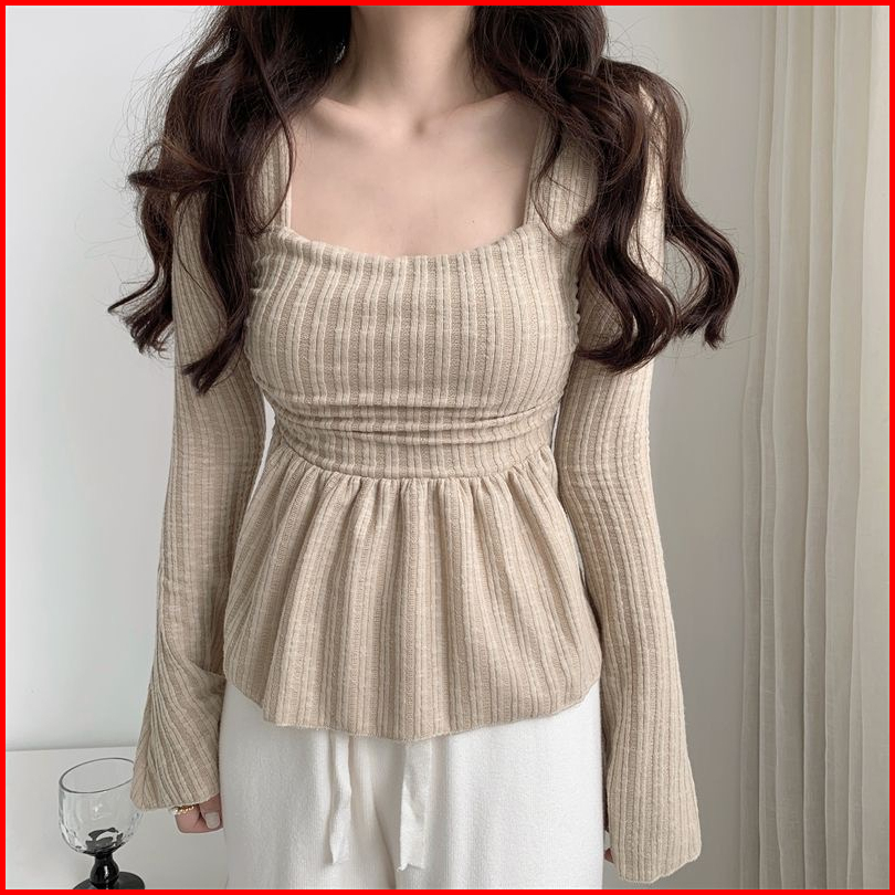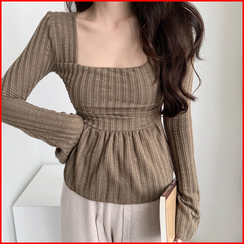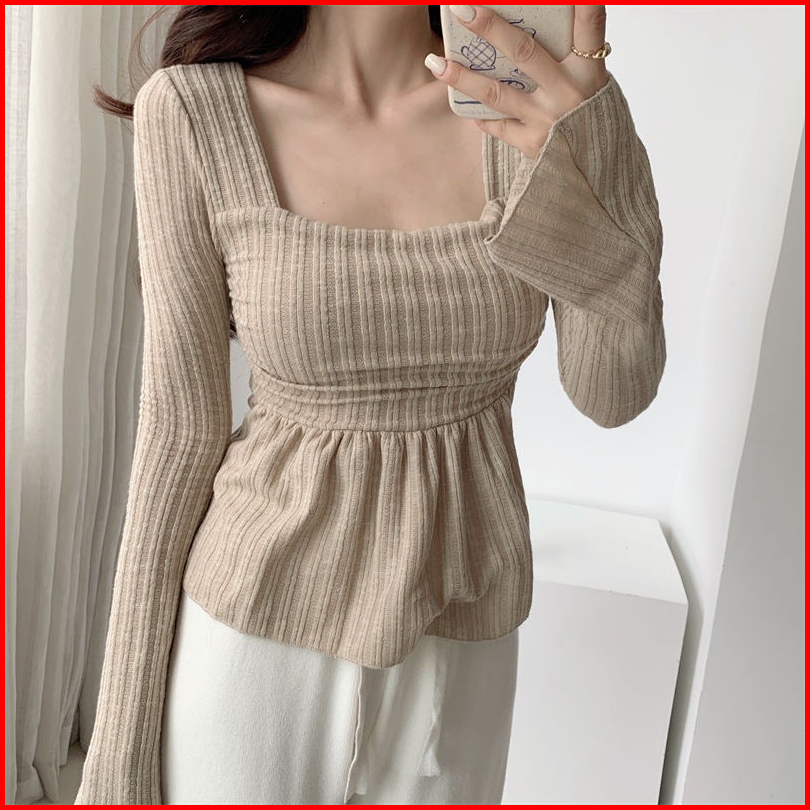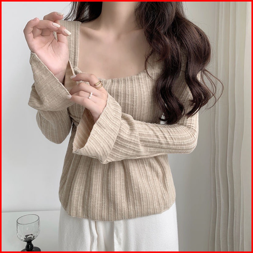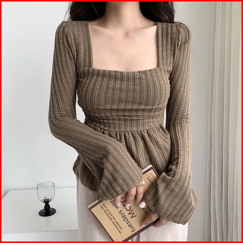 Sexy Square Collar Lengan Panjang T-shirt Wanita Kasual Slim-fit Cover Top Musim Gugur Lengan Lonceng Kaos Polos