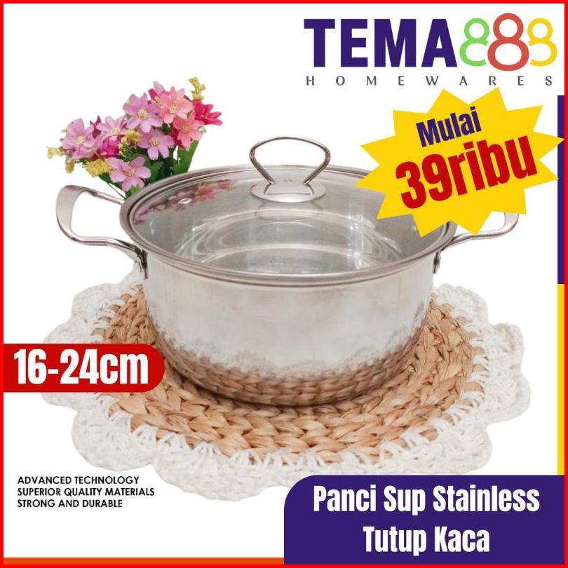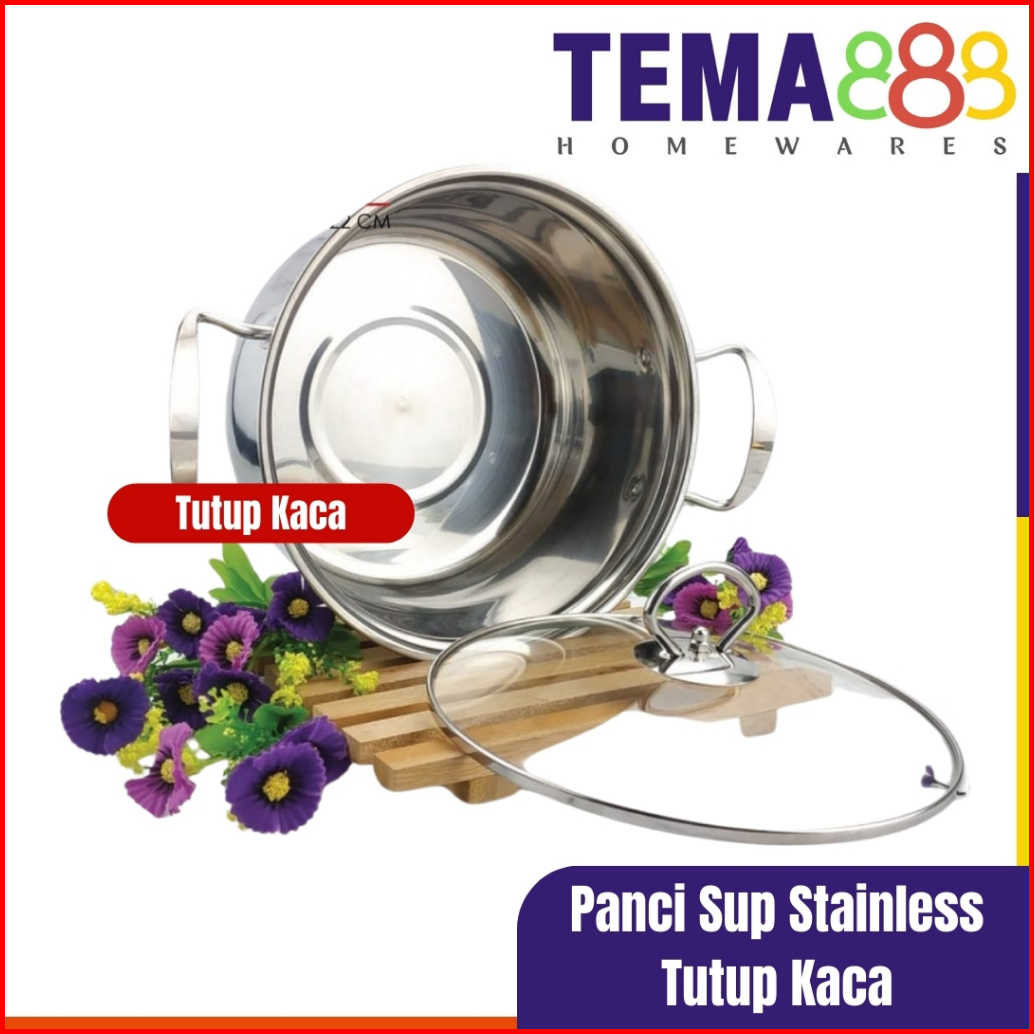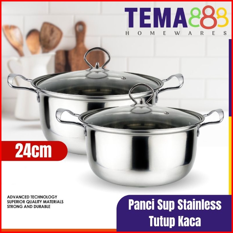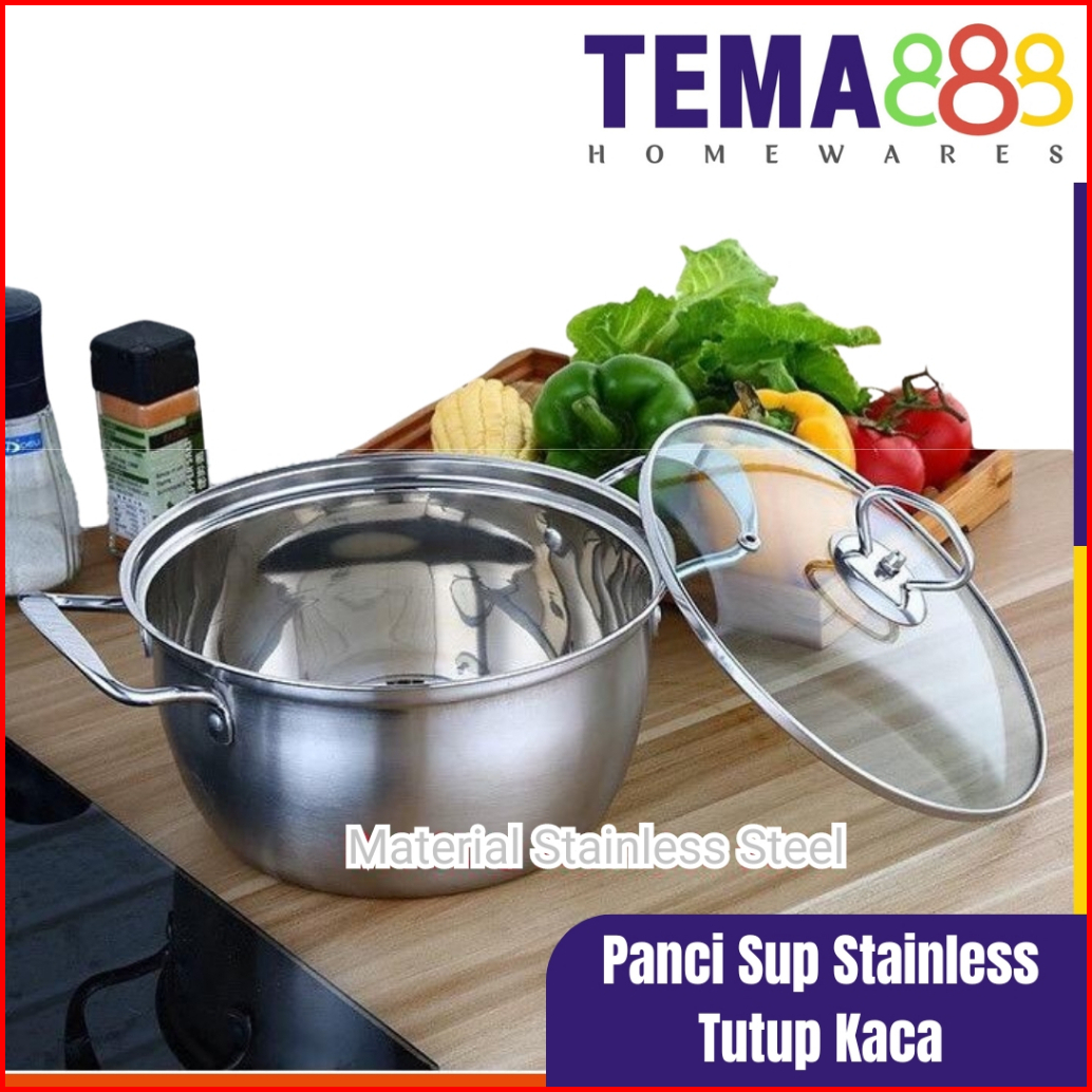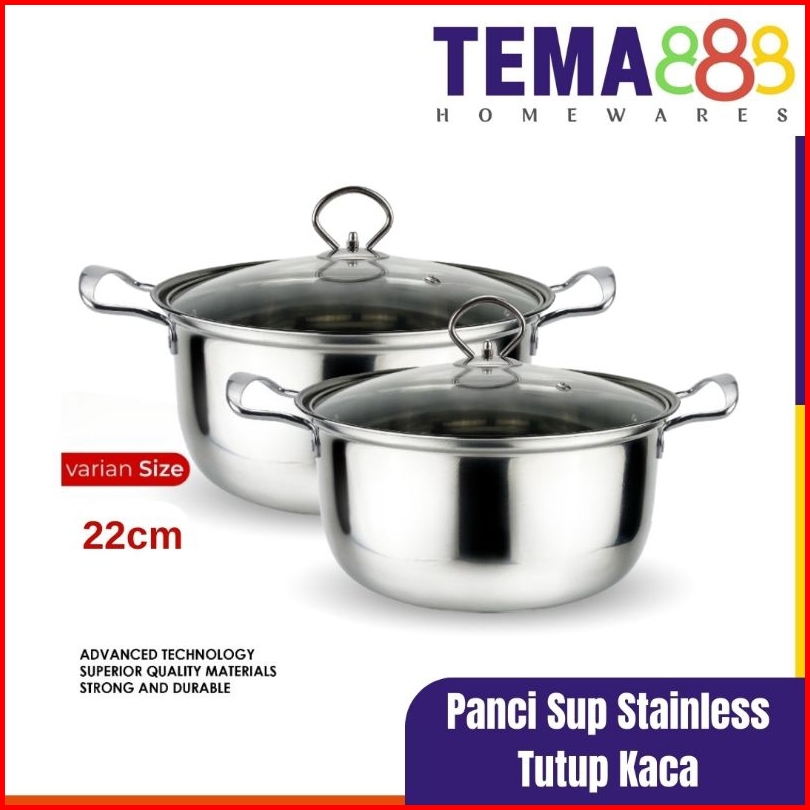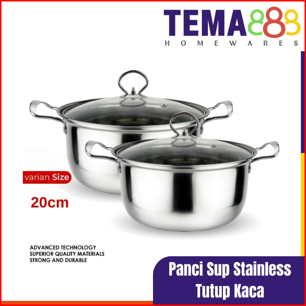 Panci Sup Tutup Kaca Stainless Steel Soup Pot 24cm 22cm 20cm 18cm 16cm Gagang Stainless