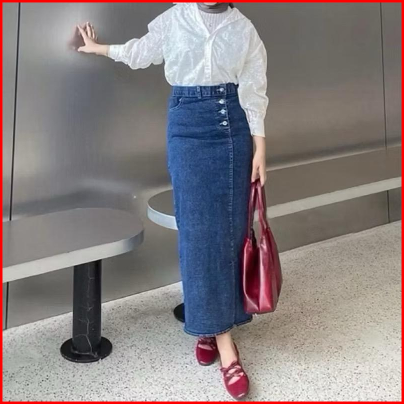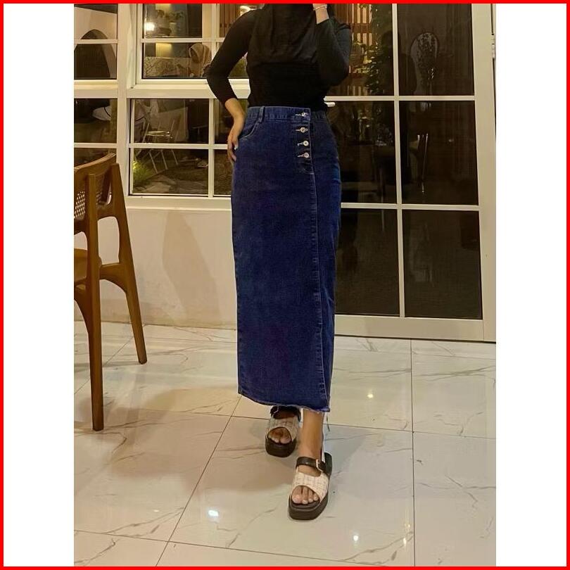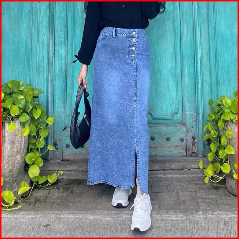 Rok Jeans Skirt Panjang High Waist Kancing Belah Samping Korean Style Kekinian - Azimah