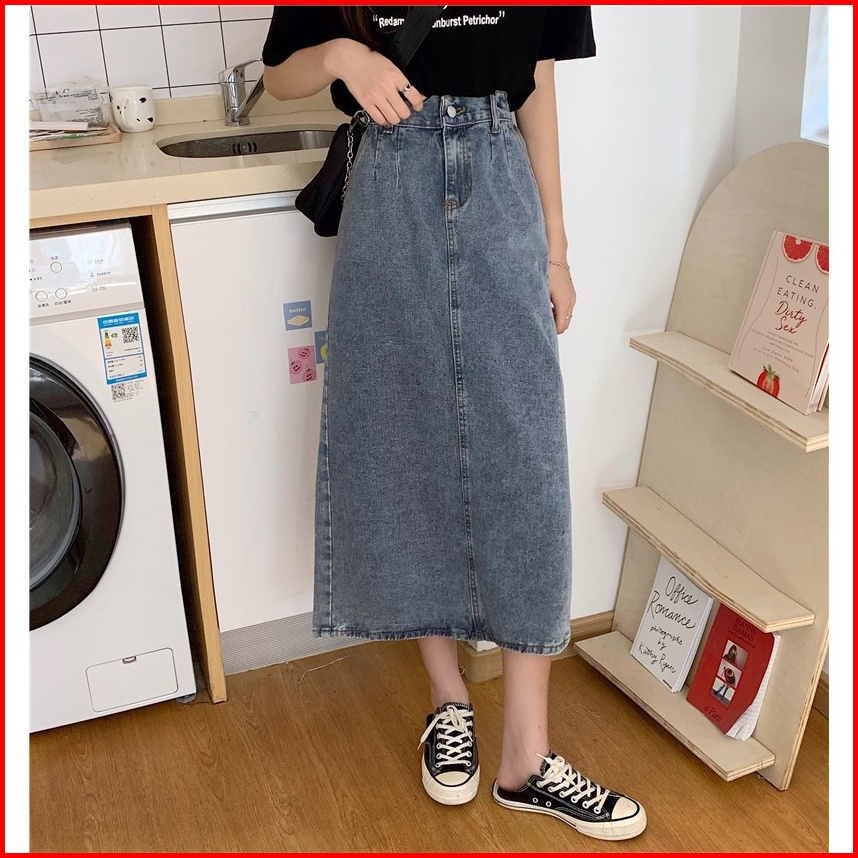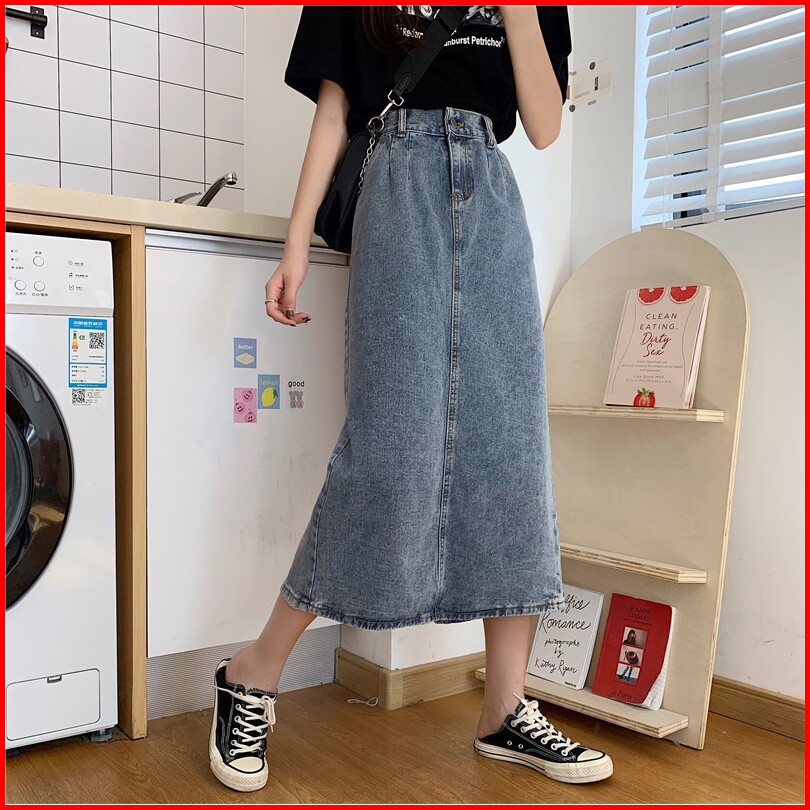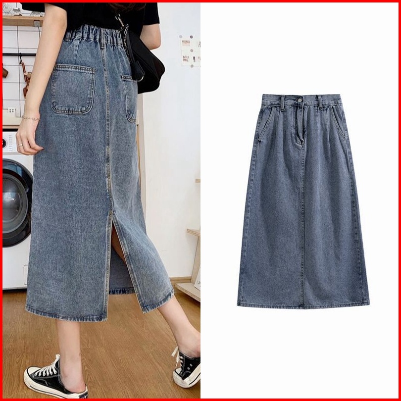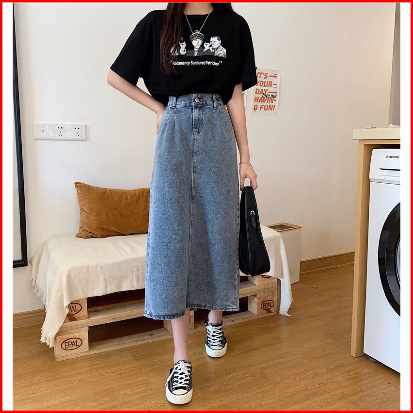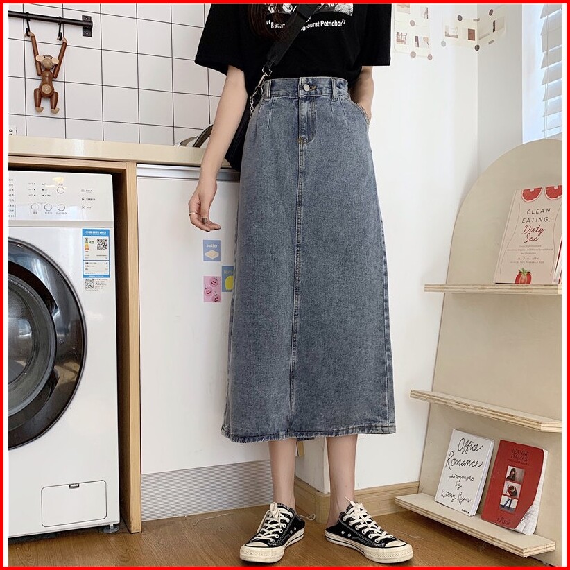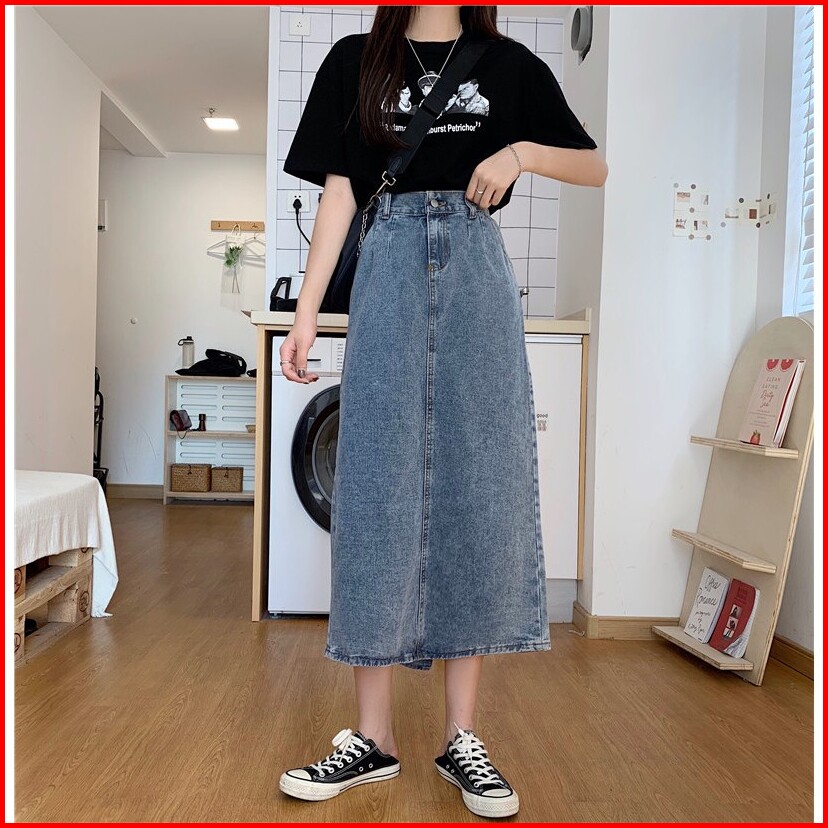 Rok Midi A-line Denim High Waist All-match Skirt Korea Style Baru Wanita