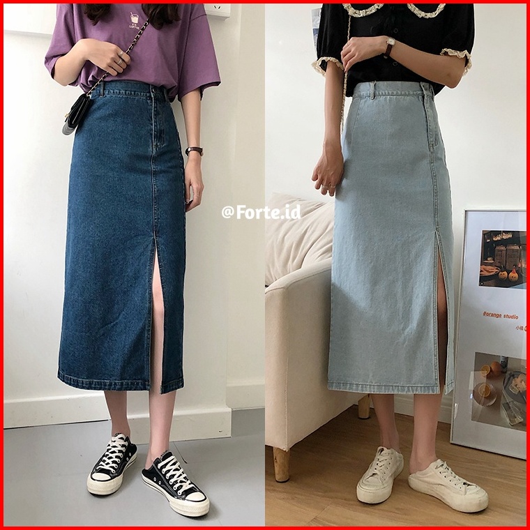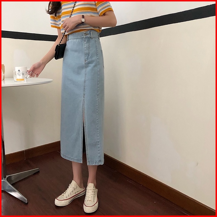 Rok Denim Panjang Wanita Korean Style Slit A-line Skirt Midi