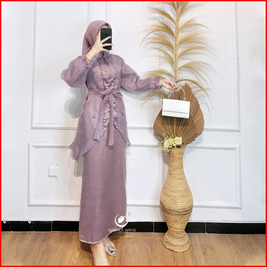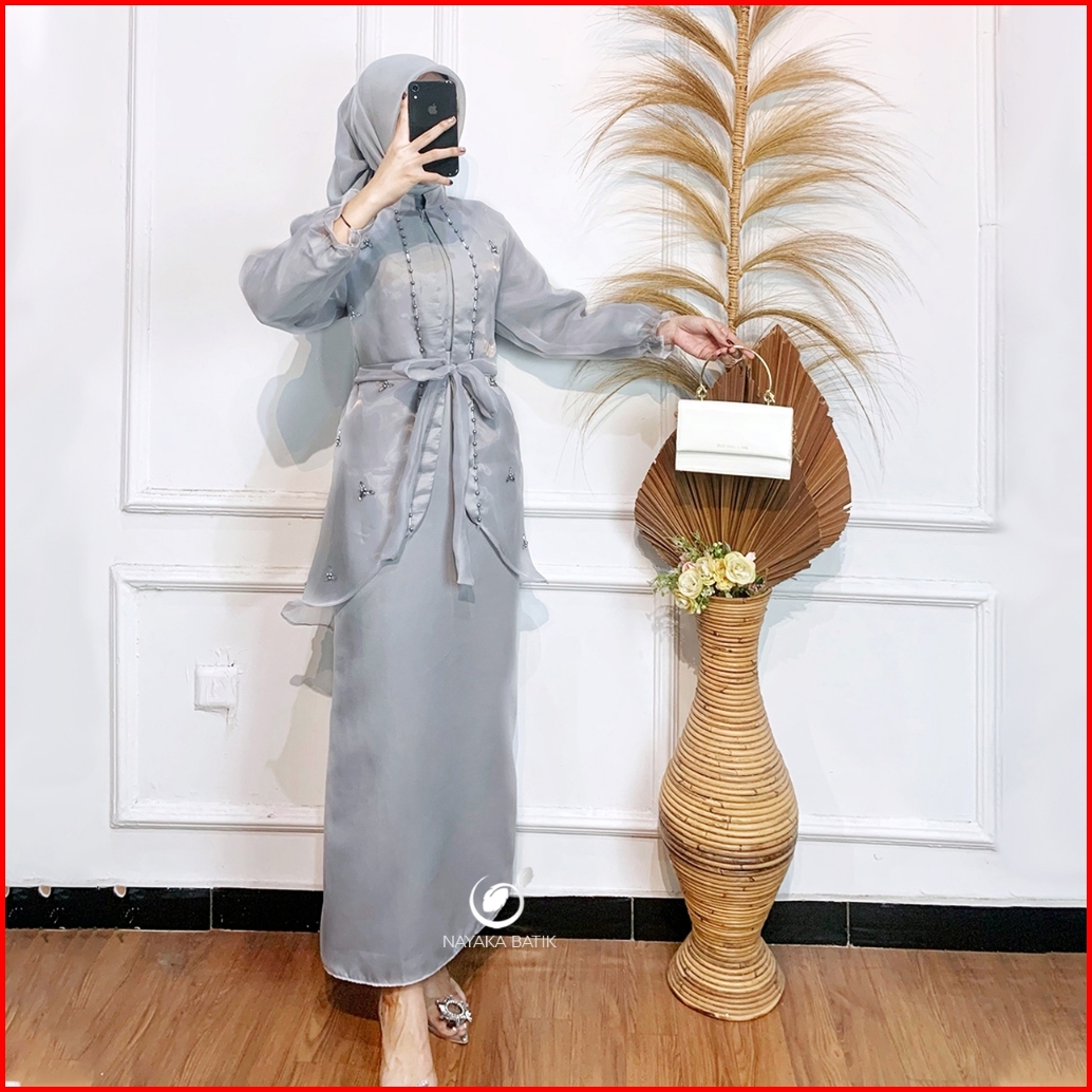 Nayaka Batik Busui Friendly - Gamis Polos Mix Organza Payet Mutiara Kekinian Safira Dress Busui Resleting Depan Fidelya