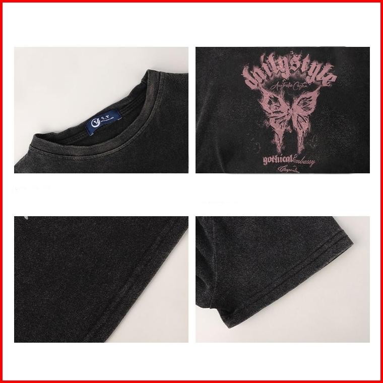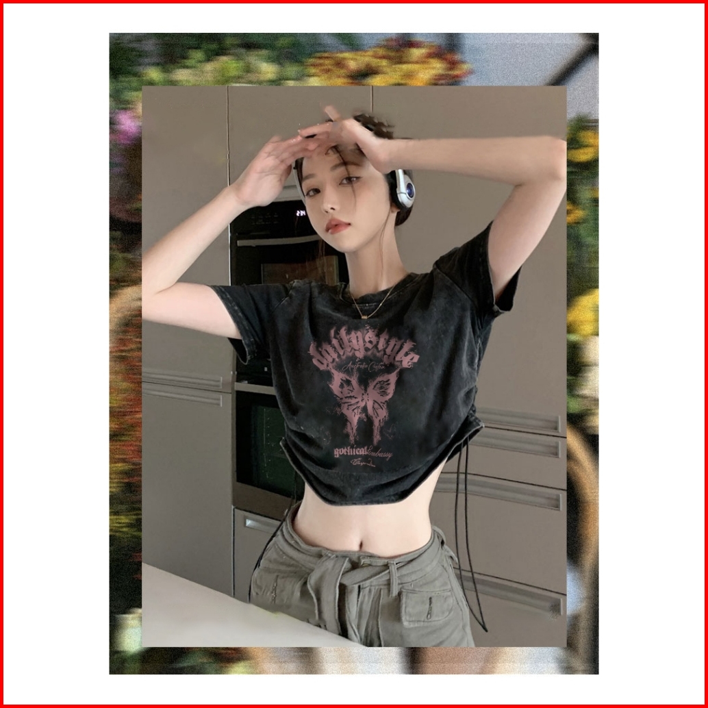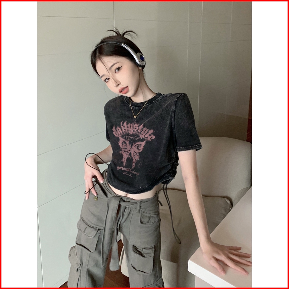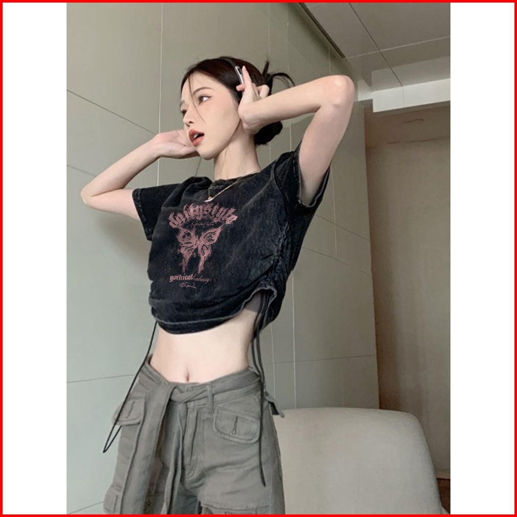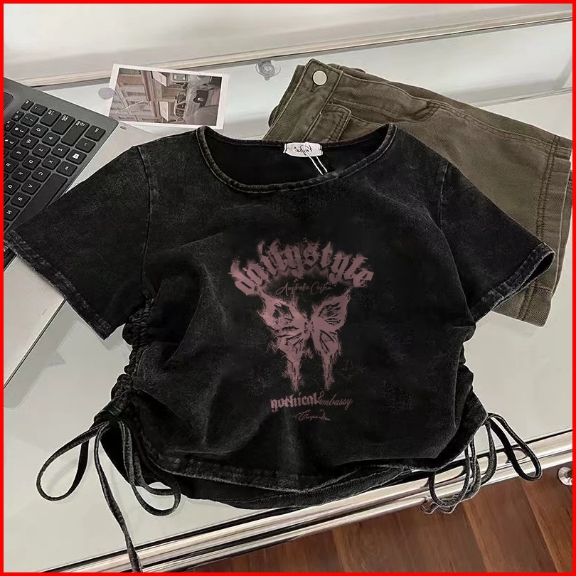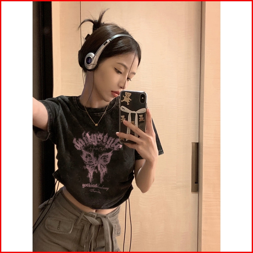 Forteid Lengan Pendek Baju Kaos Renda Pendek Baju Atasan Wanita Terbaru Cetak Kupu -kupu Gaya Korea Baju Atasan Wanita T