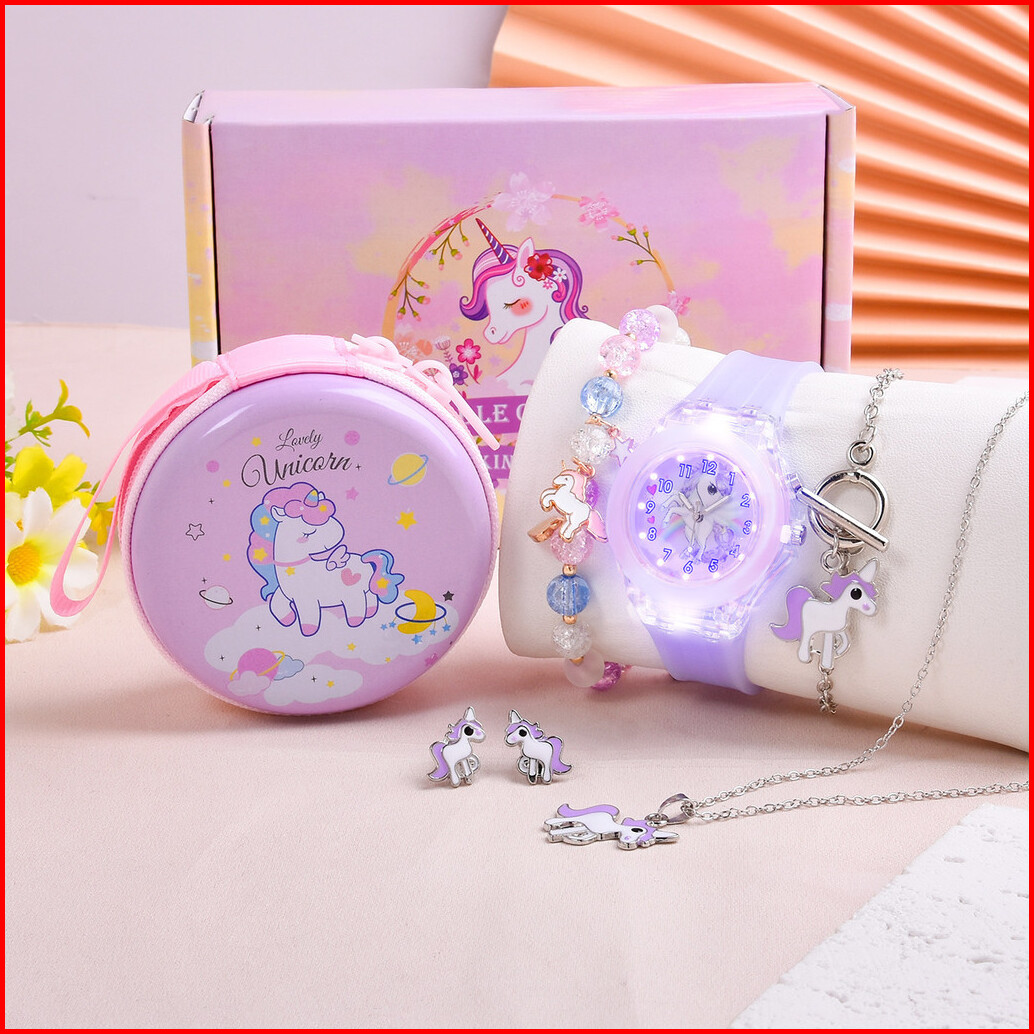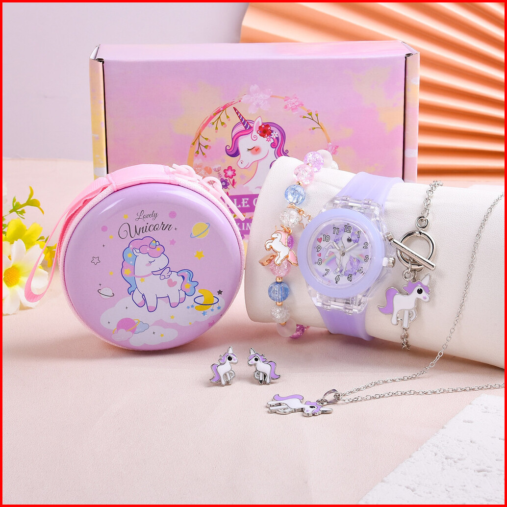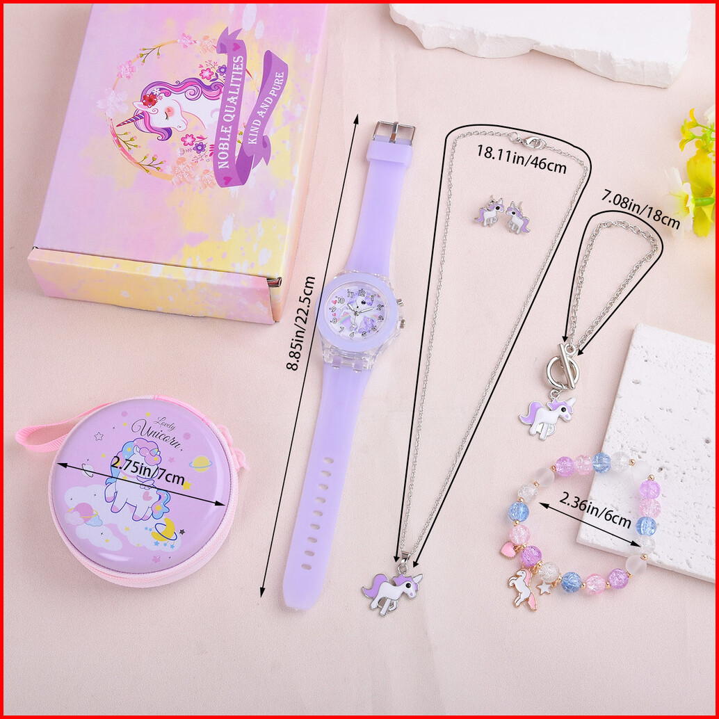6pcs Jam Tangan Kuarsa Anak-anak Lucu Tali Silikon Dial Unicorn Jam Tangan Set Aksesori Dompet Bulat Yang Serasi Tanpa K