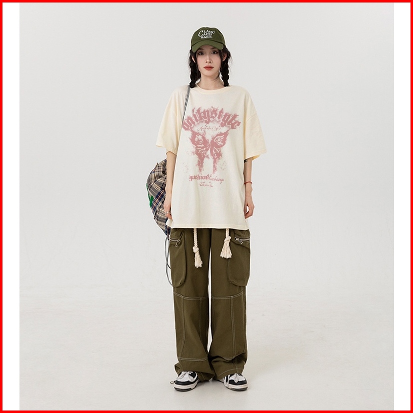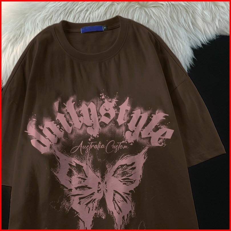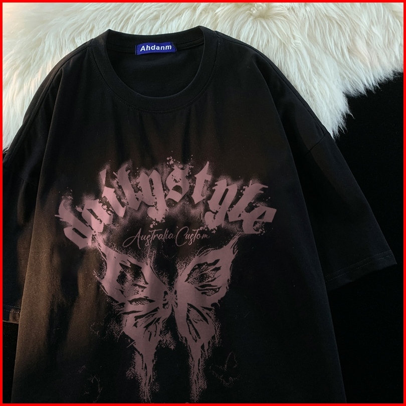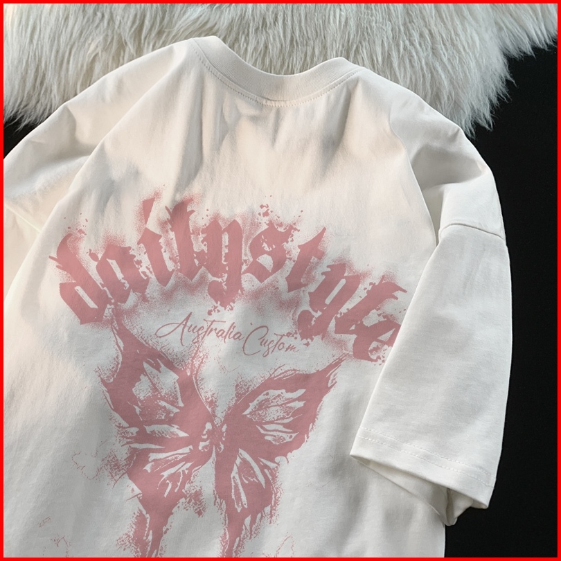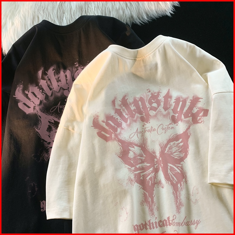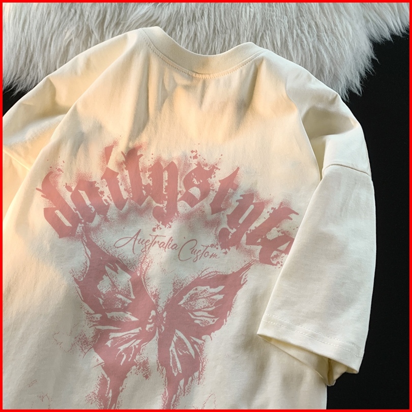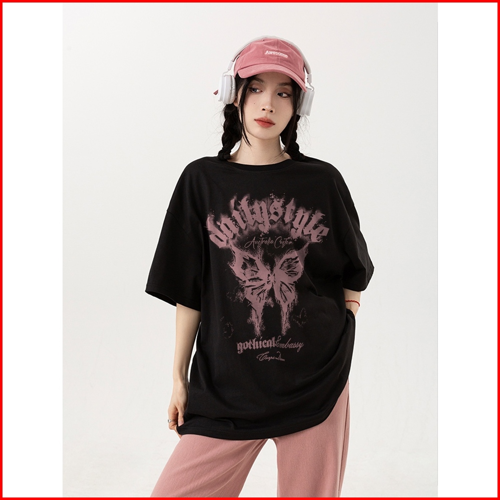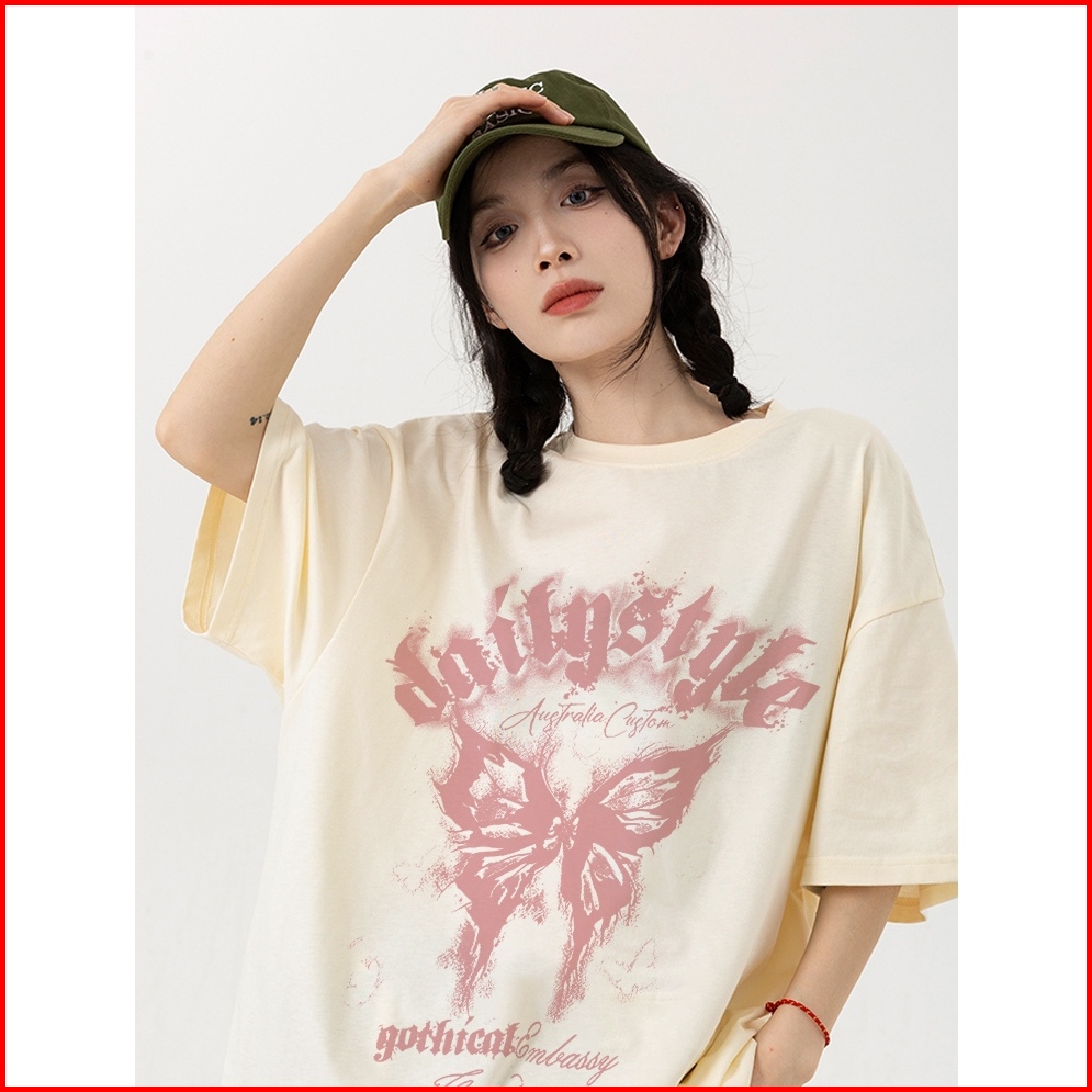 Forteid T-shirt Lengan Pendek Baju Kaos Oversize Wanita Baju Korean Style Wanita T-shirt Huruf Kupu Striped Cotton Atasa