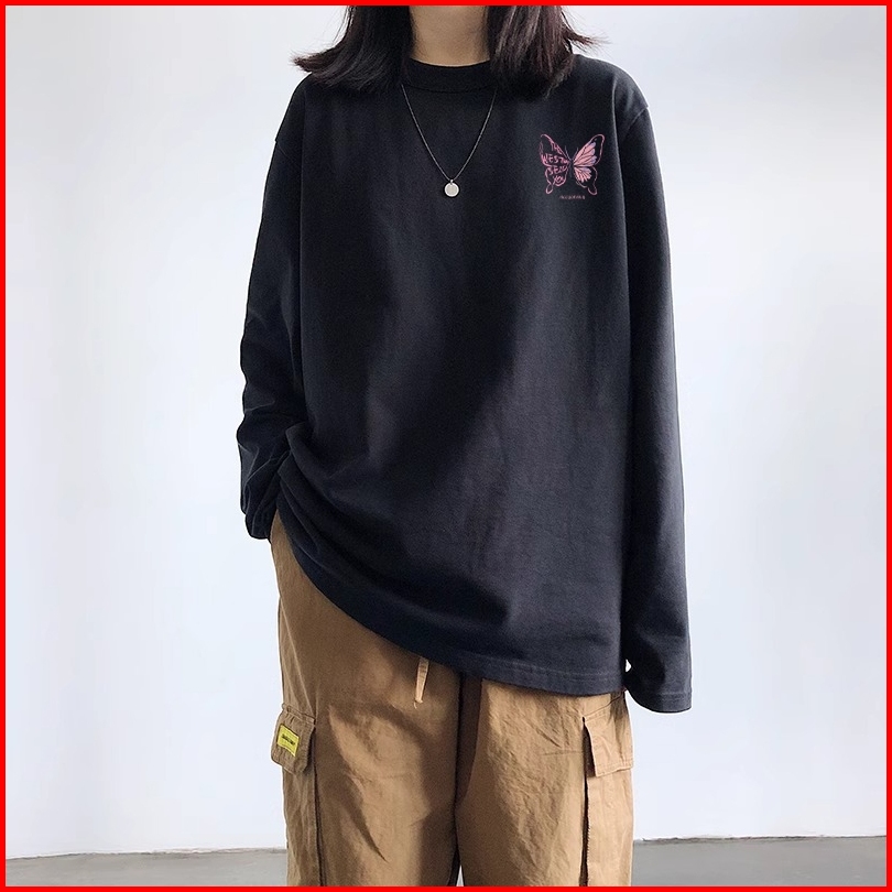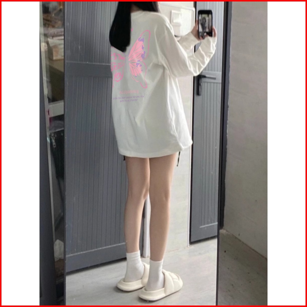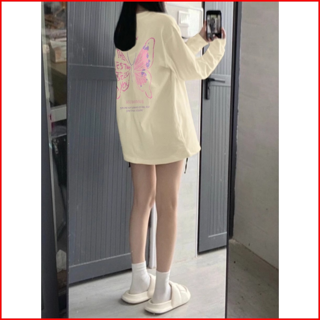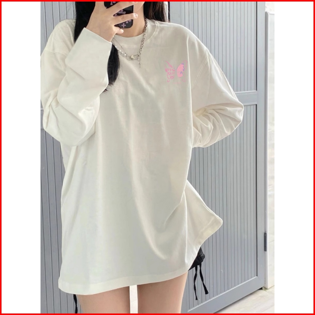 Demero Atasan Kaos Wanita Oversize Lengan Panjang Korean Style Kupu-kupu Merah Muda Baju Kaos Polos Cotton Combed Premiu
