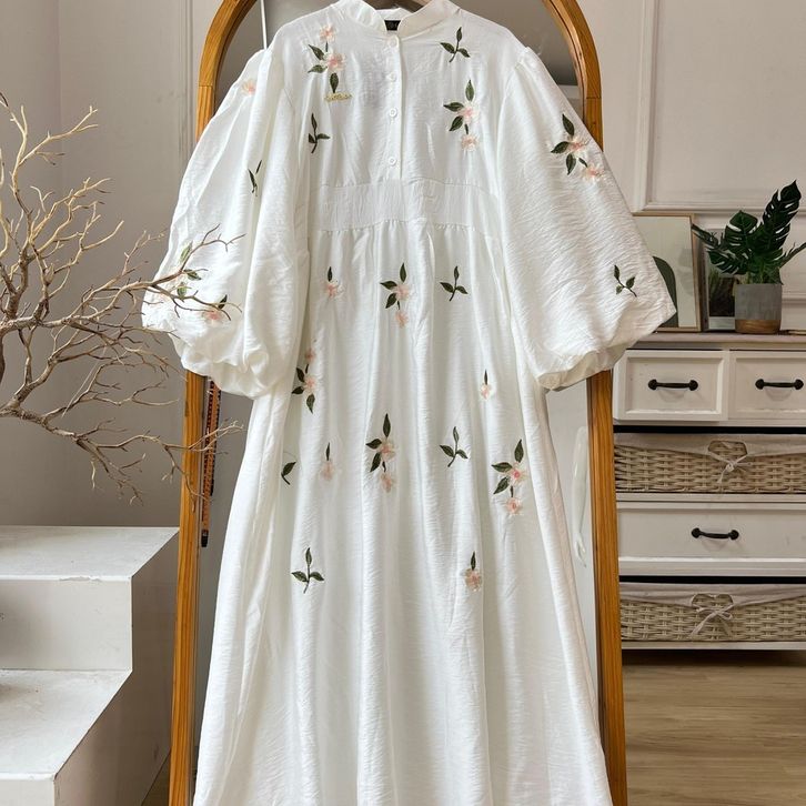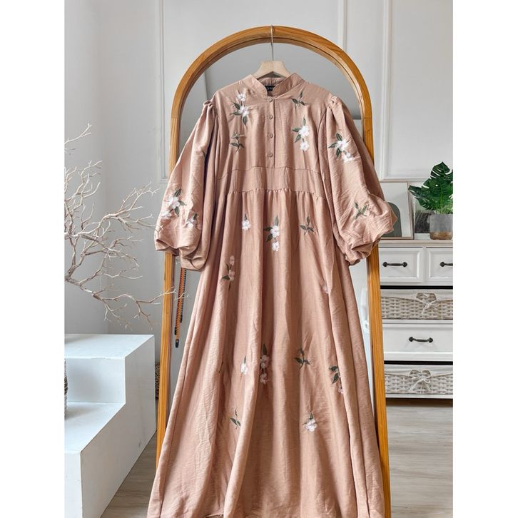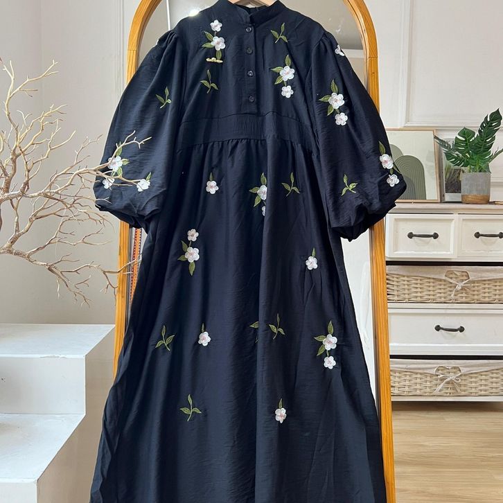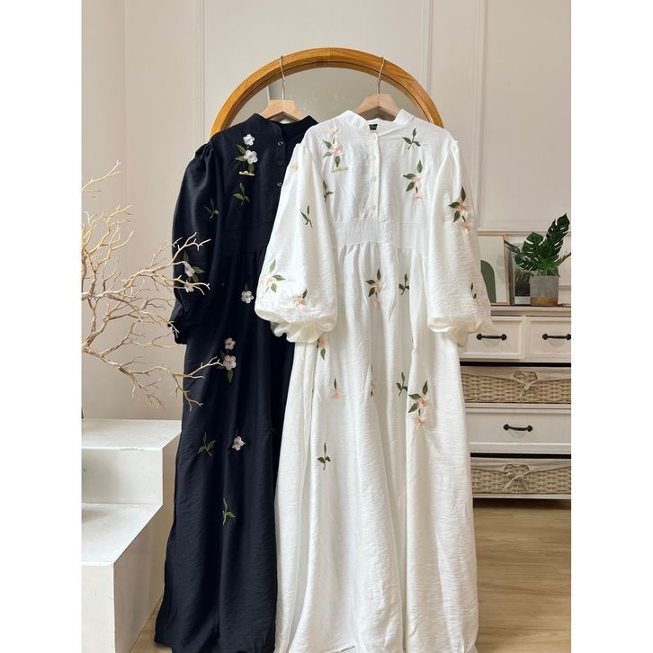 Aster Dress Gamis Bordir Bunga Timbul Katun Polo Linen Lengan Balon Busui Friendly Putih Hitam Mocca
